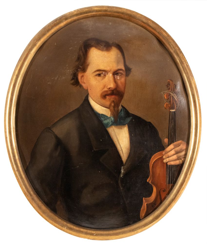 Artista anonimo, XIX secolo Ritratto virile con violino Olio su cartone cm. 71x58,5. Con cornice
