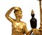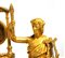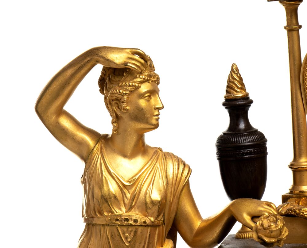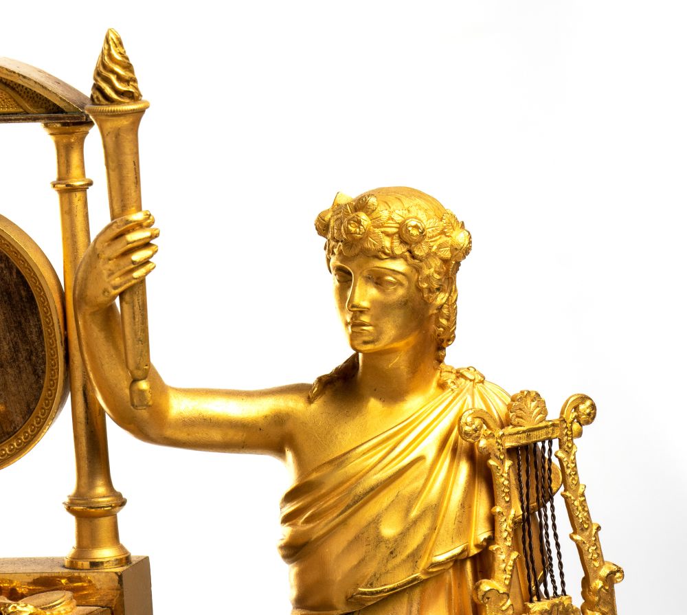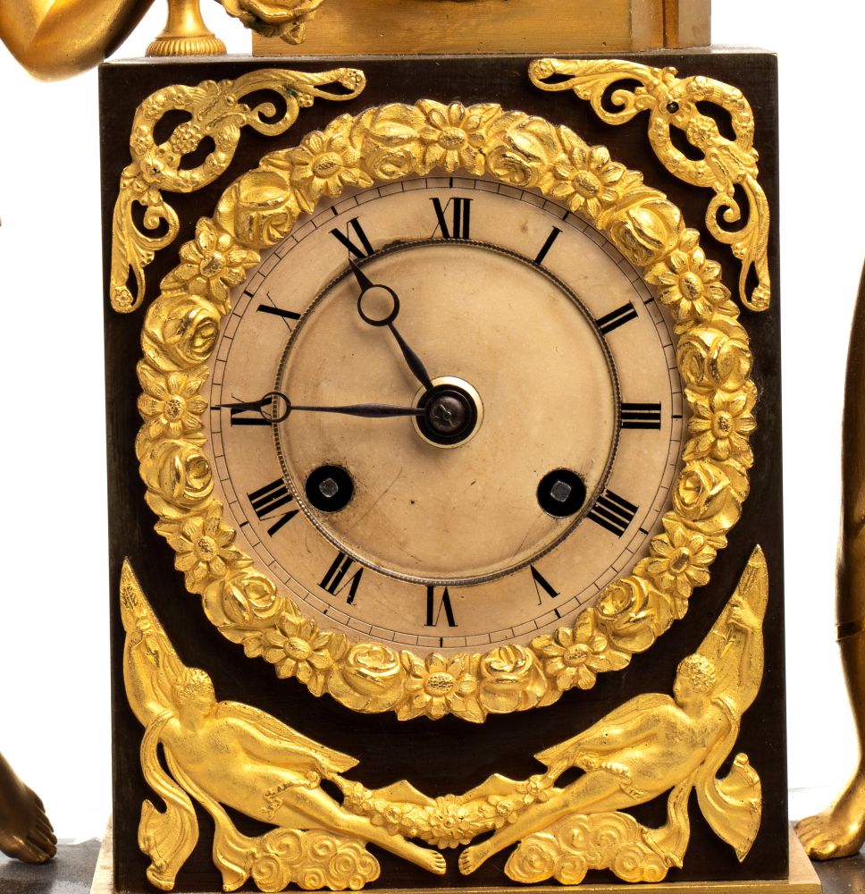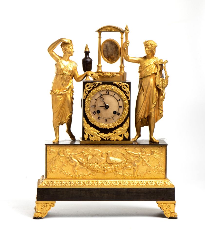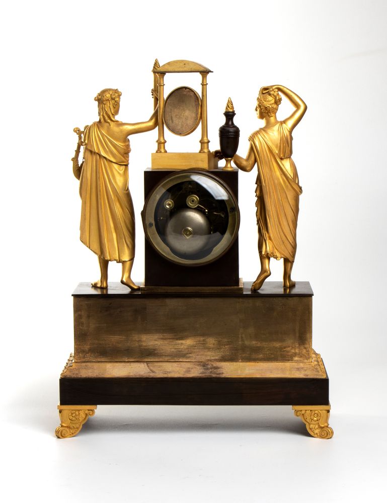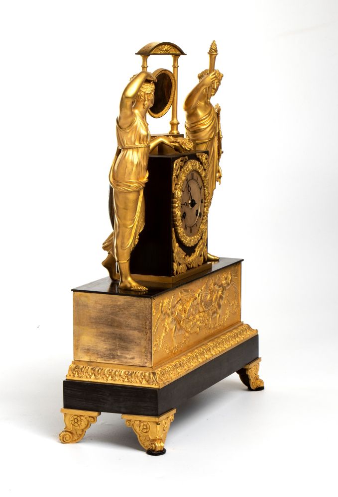 cassa in bronzo dorata al mercurio poggiante suquattro piedini fogliati, riccamente decorata nella parte superiore con figure mitologiche. Orologio con quadrante circolare dorato con due fori di carica e numeri romani, movimento con sospensione a filo, regolatore a pendolo e suoneria delle ore e delle mezze su campana.