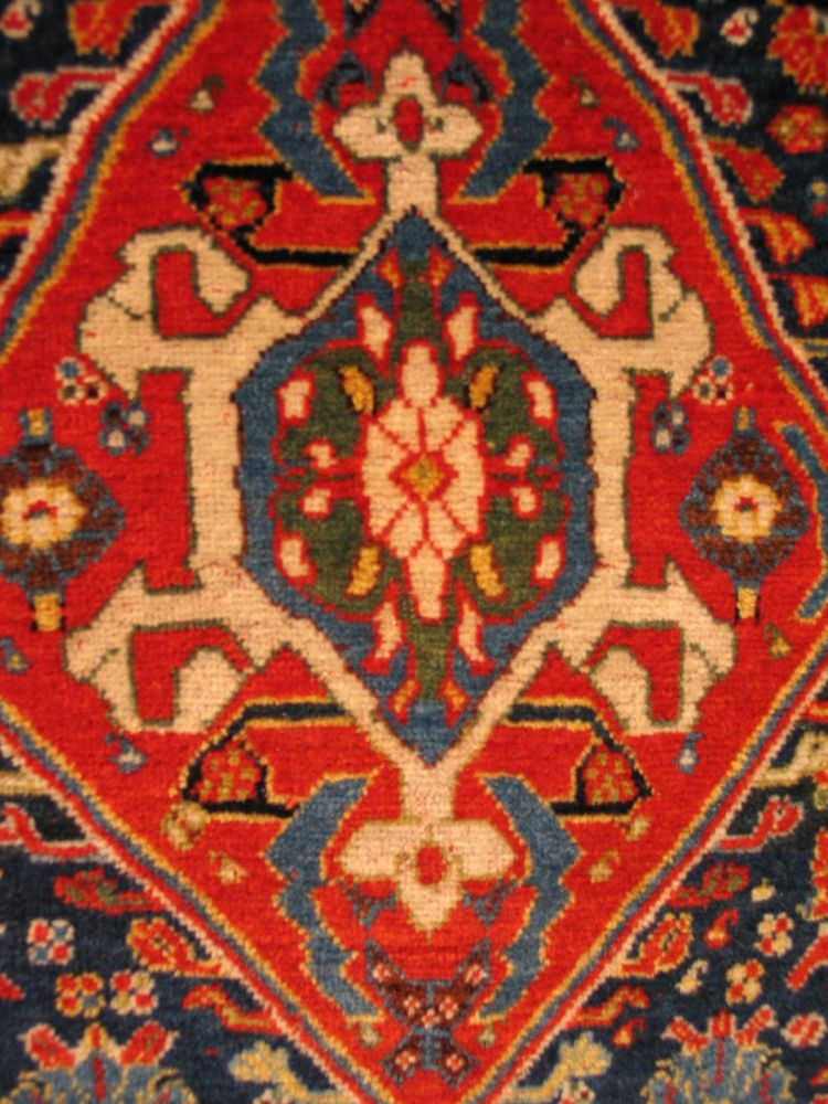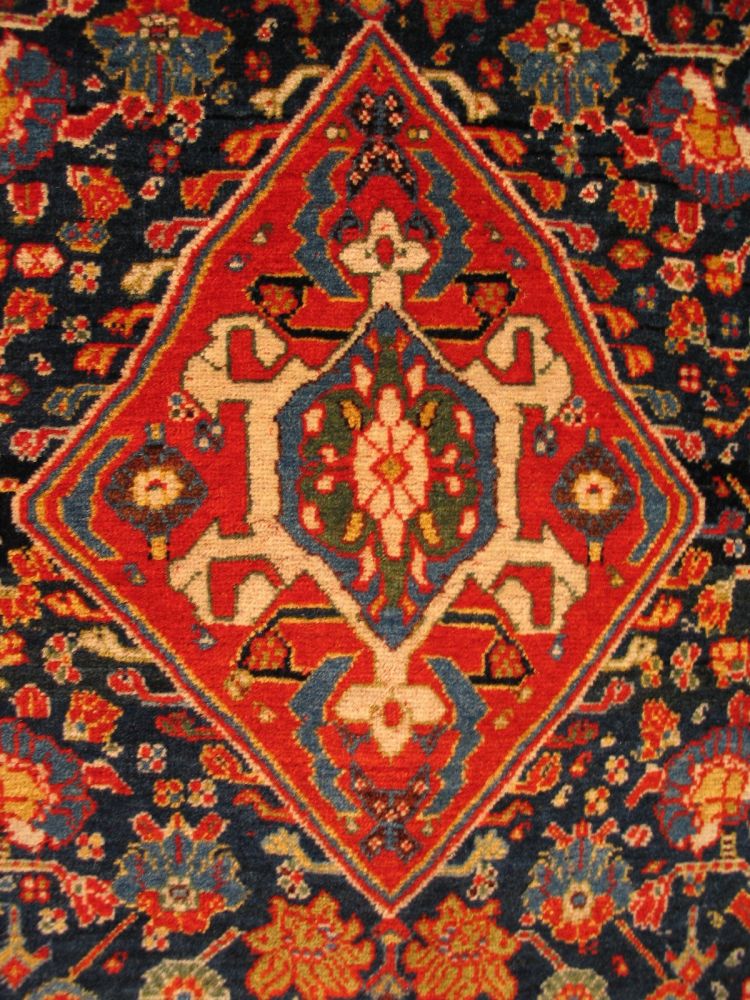 lana su trama e ordito in cotone, decorato da un disegno centrale a medaglione con motivi floreali stilizzati e la ricchezza cromatica(blu notte, rossi intensi, crema) sono caratteristiche tipiche di queste manifatture del sud-ovest dell'Iran. I cantonali e le ampie bordature presentano motivi vegetali e floreali su fondi chiari e policromi.
