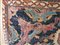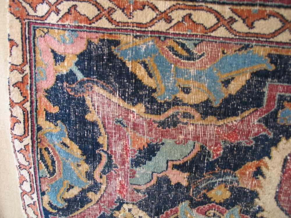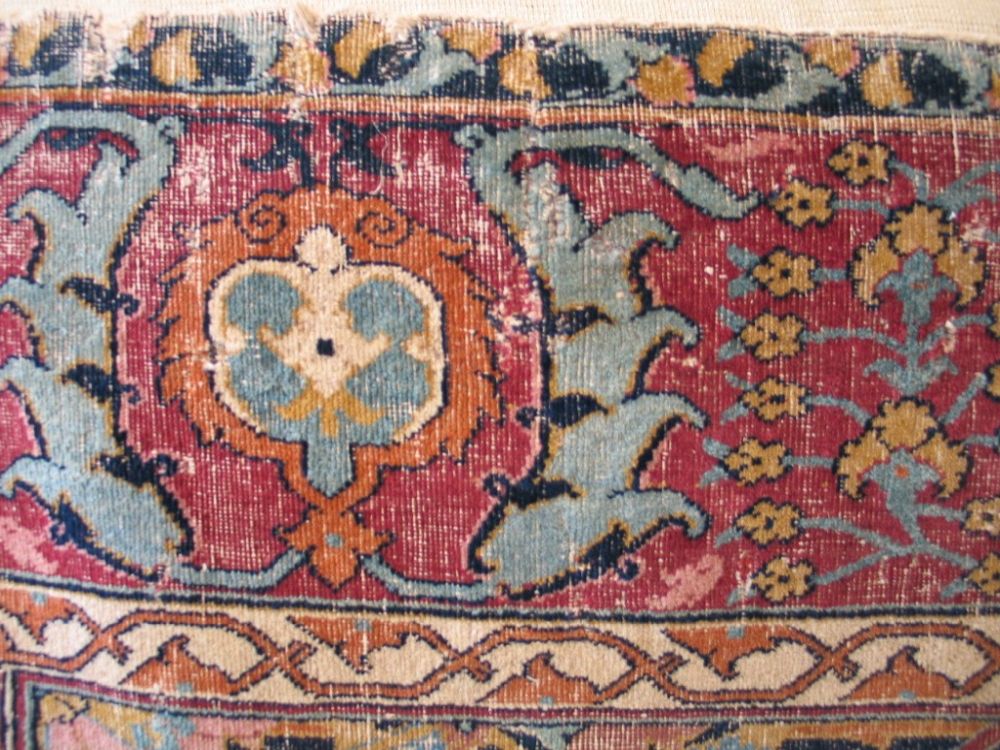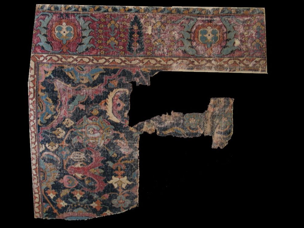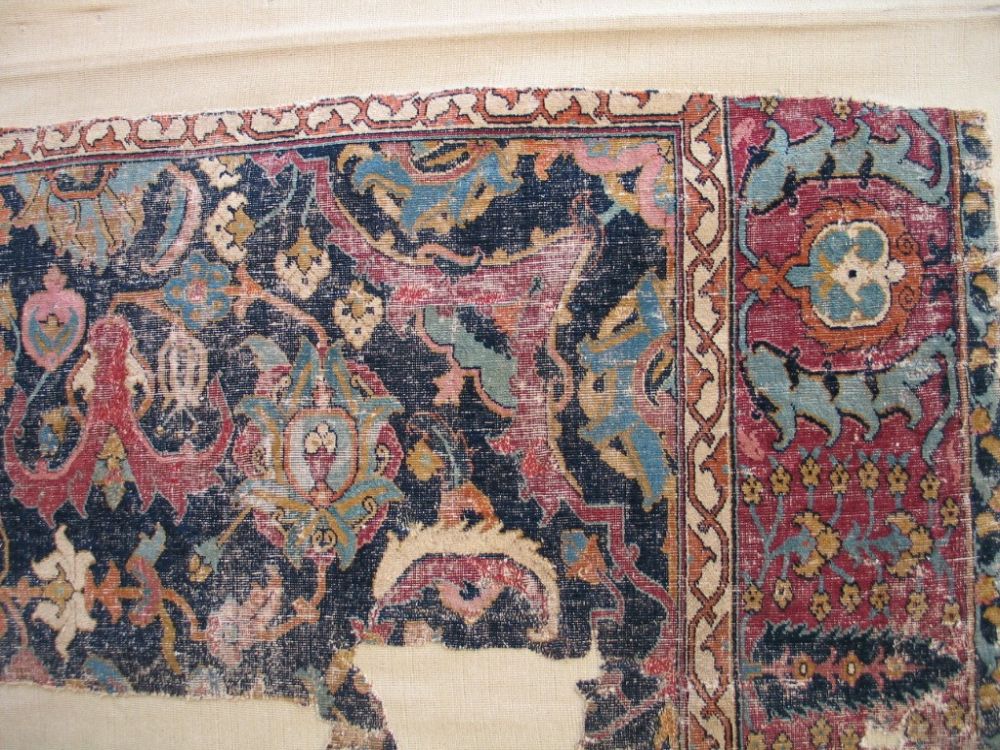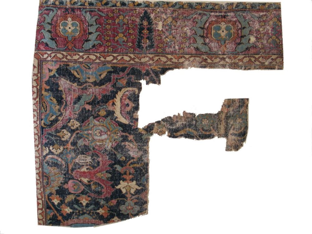 Frammento Kirman detto “a vasi”, tardo XVI secolo, nodo asimmetrico. 85x90 cm. Su un fondo blu notte è generosamente decorato da un elaborato disegno floreale, la composizione è un armonioso intrico di Shah Abbas che legano tra loro palmette, sviluppatesi dai simbolici fiori orientali di loto e di peonia, e le foglie ricurve. Il bordo principale è rosso rubino coperto con palmette e cipressi, che è accompagnato da un’onda di viticcio doppio su fondo chiaro all’interno e su fondo blu all’esterno.
