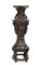 La patina scura e uniforme del bronzo conferisce al pezzo una raffinata solennità, sottolineando l’alta qualità artigianale. Il vaso è montato su una solida base in legno tornito, probabilmente coeva, che ne esalta la presenza scultorea.