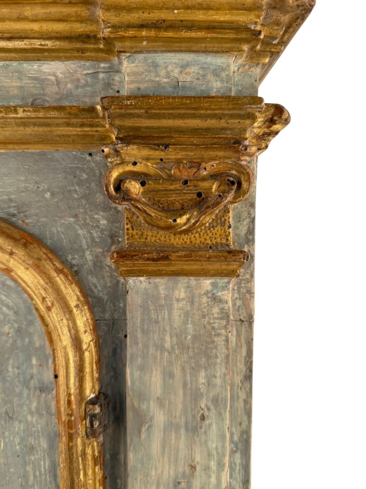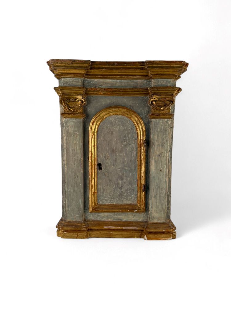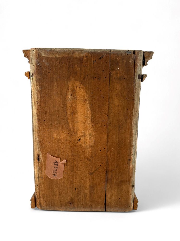 Gruppo raffigurante Natività entro tabernacolo ligneo XIX secolo Altezza x larghezza x profondità: 45 x 34 x 32 cm.