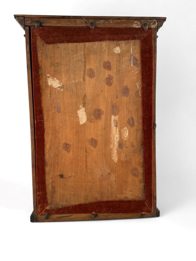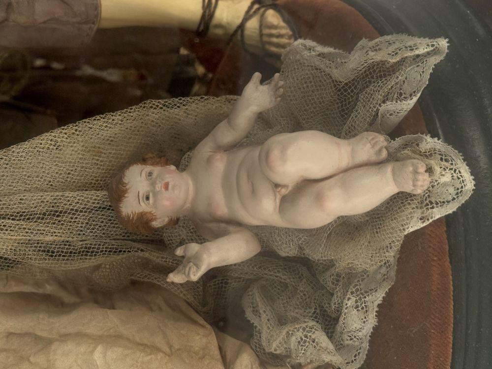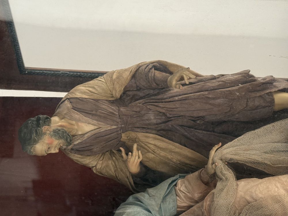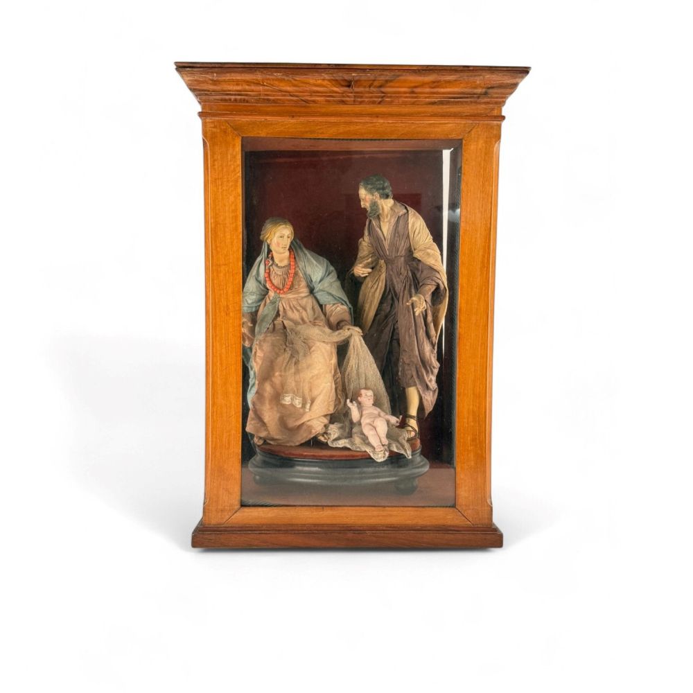 L'opera è inserita in una vetrina in legno, raffigura la scena della Natività con Giuseppe, Maria e Gesù Bambino. Le teste sono in terracotta policromata, gli arti in legno, corpo in stoppa e vesti in seta.