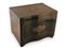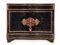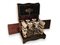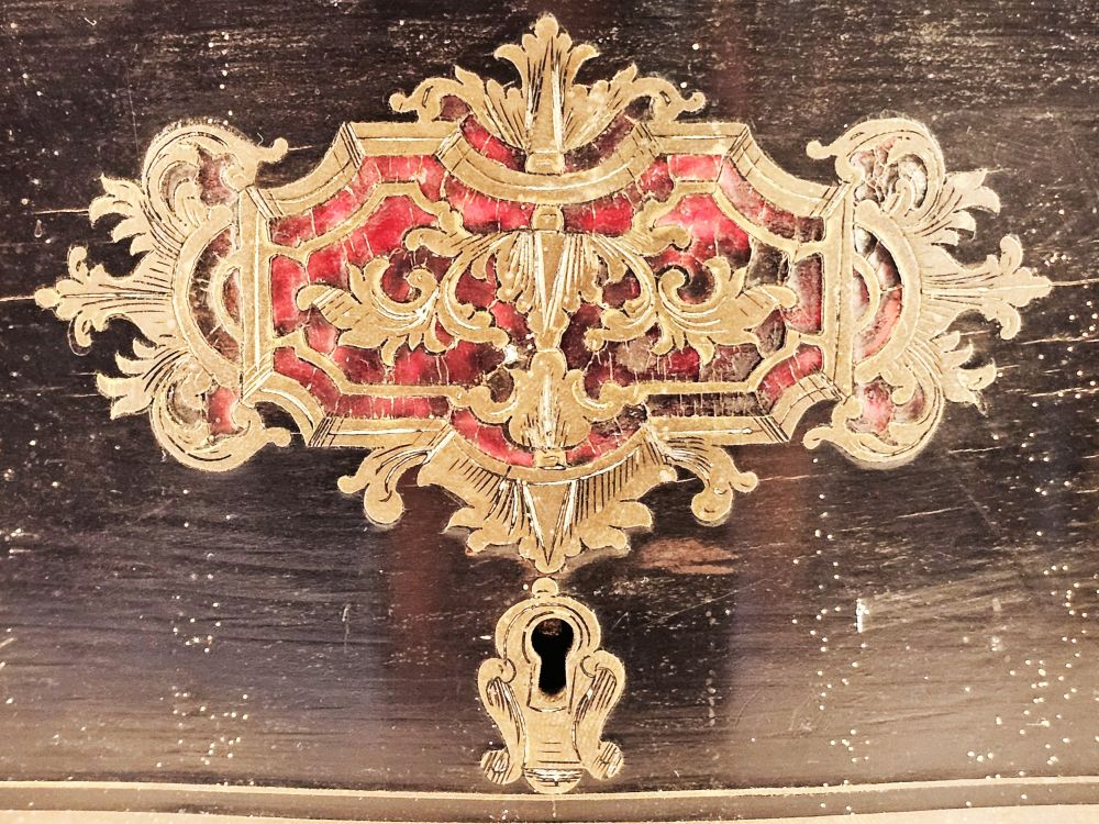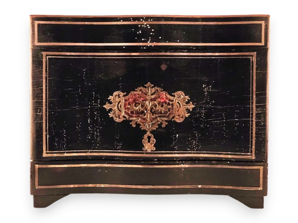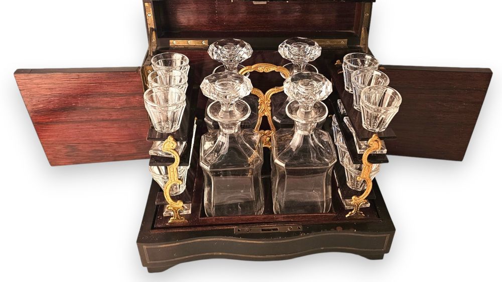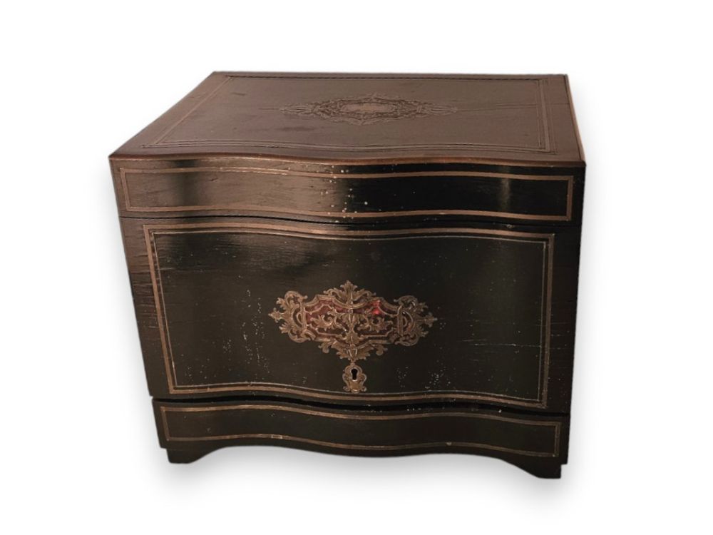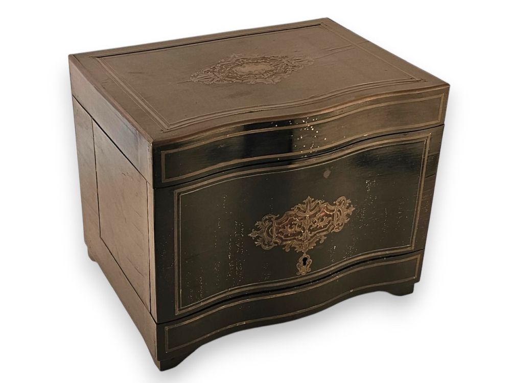 in legno ebanizzato con fronte sagomato, con intarsi in ottone e tartaruga (hawksbill sea turtle, Eretmochelys imbricata, Cheloniidae) a motivi fitoformi in stile Boulle sul coperchio e sul fronte. Nella parte sono collocate quattro bottiglie e dodici bicchieri in vetro molato.