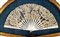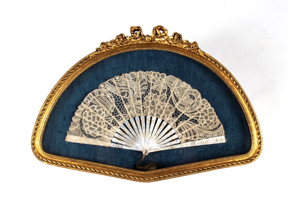 con stecche in madreperla incisa a decori floreali e decorata con tessuto in pizzo con motivi floreali, inserito in cornice dorata e sfondo in tessuto blu.