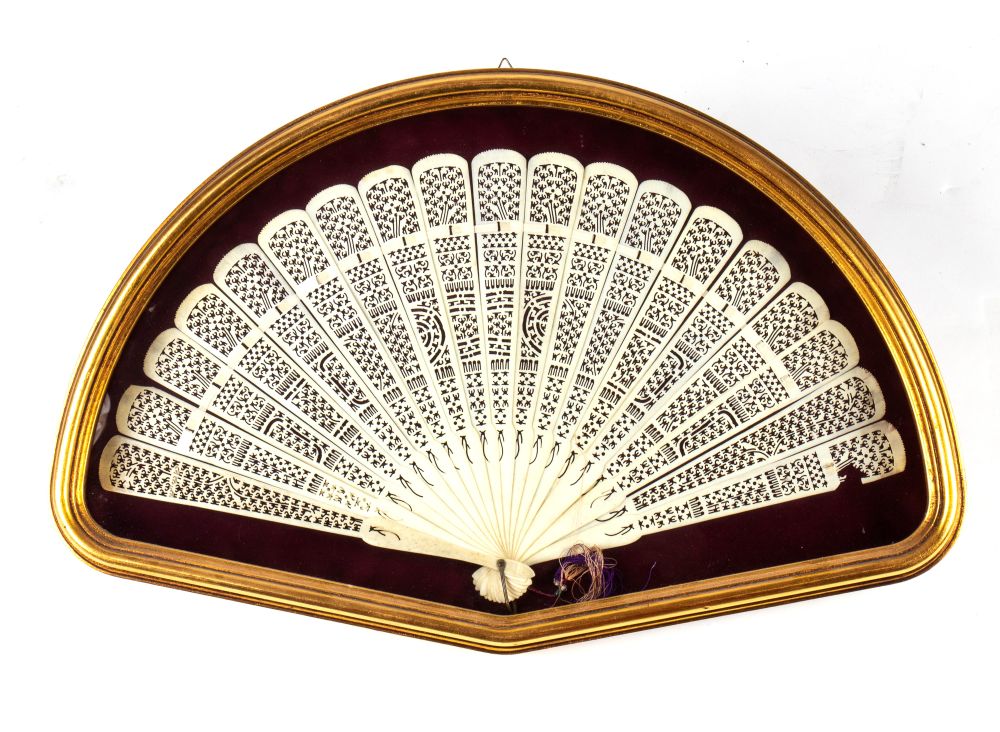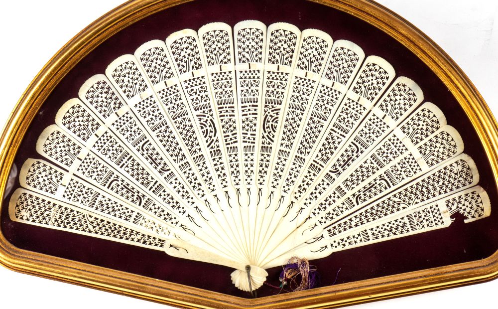 pieghevole finemente traforato, realizzato in osso. Composto da stecche sottili e lavorate con estrema precisione, presenta un elaborato traforo di gusto neoclassico, tipico della raffinata produzione europea dell’epoca. Le stecche, ricavate da osso lucido e uniformemente chiaro, sono decorate a giorno.