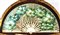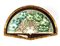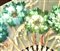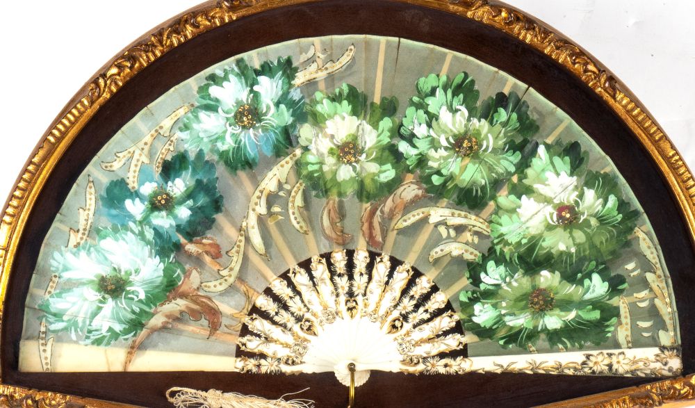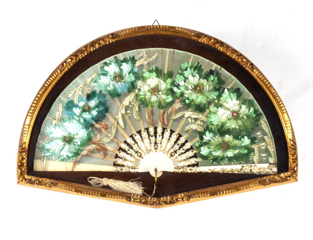 pieghevole realizzato con stecche in osso finemente intagliato. La parte decorata, dipinta a mano, mostra un ricco motivo floreale composto da fiori verde smeraldo e bianco accompagnati da sinuosi nastri dorati che donano movimento e leggerezza alla composizione. Il ventaglio è esposto in una cornice semicircolare, dorata e lavorata con gusto ornamentale. È presente anche una nappa decorativa in filo chiaro, dettaglio che richiama la moda femminile dell’epoca e aggiunge un tocco di raffinatezza.