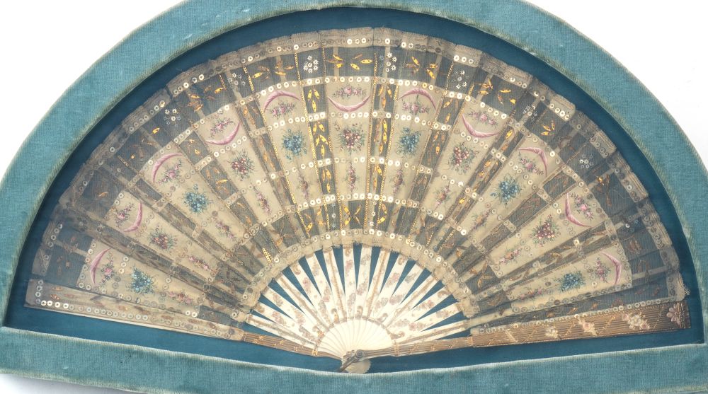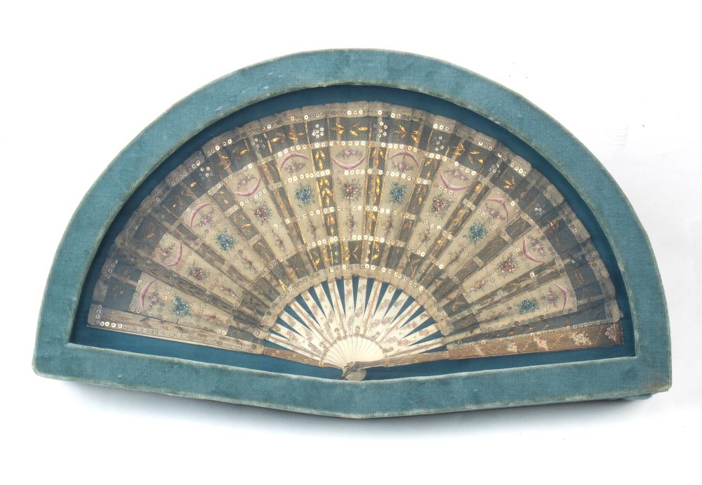 collocabile nel contesto della Belle Époque, si distingue per l’elevata eleganza e l’accurata decorazione. Realizzato con stecche in osso finemente lavorate con motivi floreali e decorazioni dorate, la guardia presenta incisioni vegetali. Inoltre, presenta uno strato in tessuto dipinto probabilmente a mano con motivi floreali policromi in stile neorococò: ricca e simmetrica, con piccoli bouquet centrali, riquadri, motivi lunari e ghirlande, arricchita da paillettes metalliche, lustrini e dorature a lamina che creano effetti scintillanti pensati per ambienti teatrali o mondani. Conservato in una cornice rivestita in velluto azzurro.