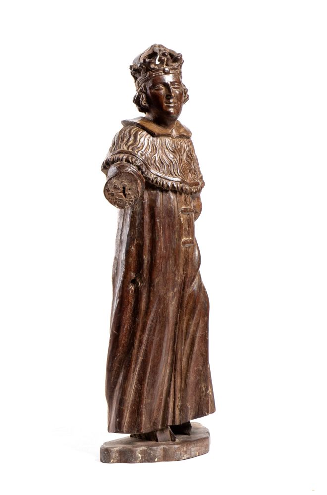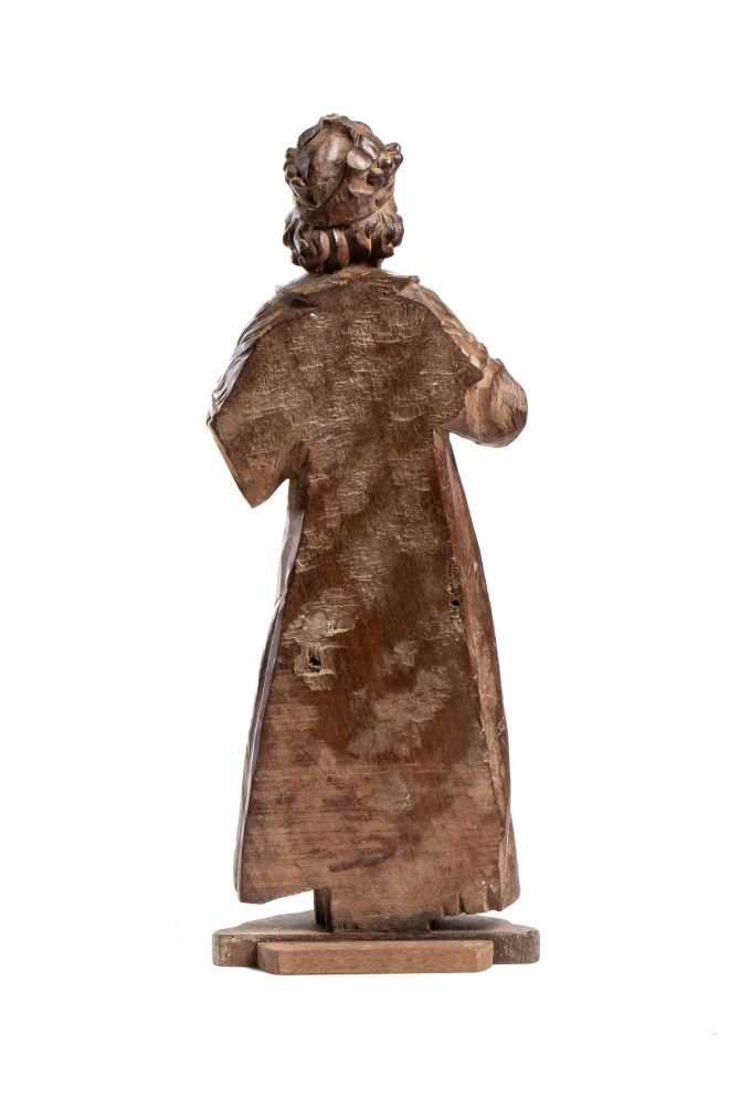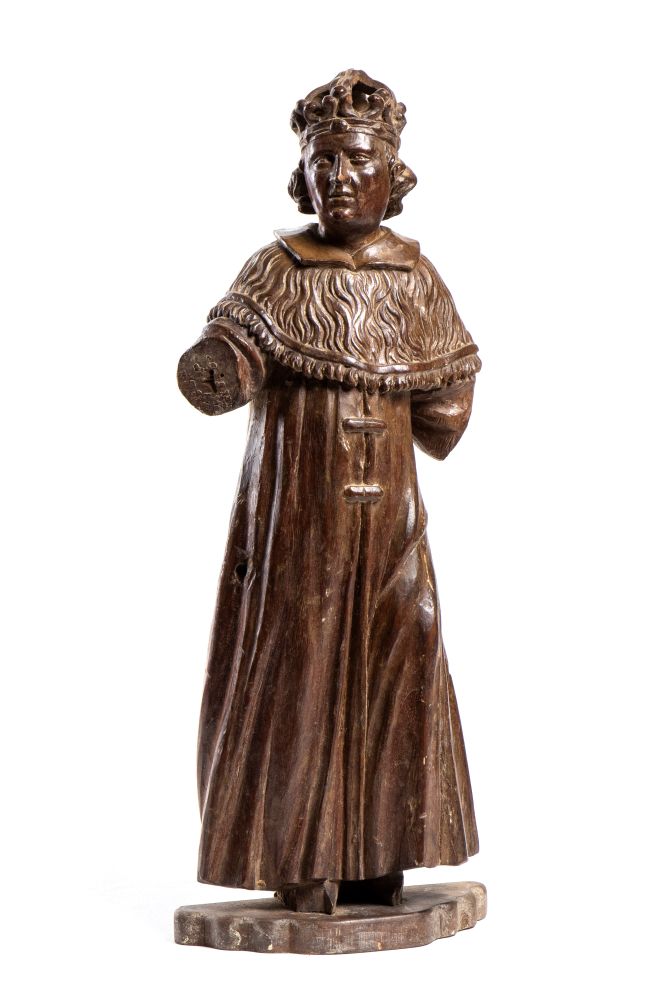 raffigurante una figura maschile, probabilmente un sovrano o una figura sacra. La figura, caratterizzata da un ampio mantello e sauna corona elaborata, presenta un espressione solenne e un intaglio di notevole fattura evidenziato dalle pieghe della veste e dei capelli.