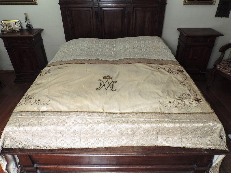 PALIOTTO D'ALTARE IN ERMISINO DI SETA COLOR BURRO fine del XVIII/inizio del XIX secolo ricamato a fili dorati con volute e motivi floreali nei toni del rosa, verde e azzurro, impreziosito da pietre dure incastonate, centrato da monogramma mariano, difetti cm 87x190 SILK EMBROIDERED ALTAR CLOTH, LATE XVIII CENTURY