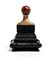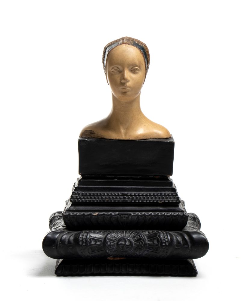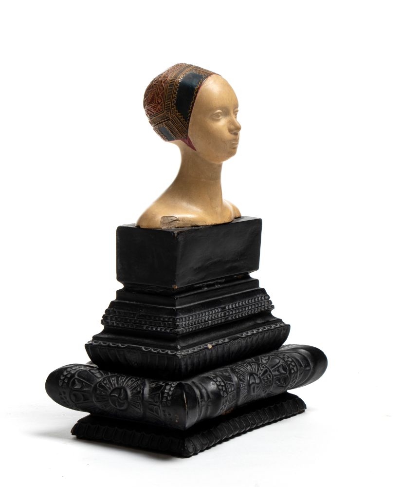 La testa, delicatamente modellata con lineamenti stilizzati e capelli raccolti sotto una cuffia decorata, è montata su base architettonica in stile classico, con ricchi motivi ornamentali.