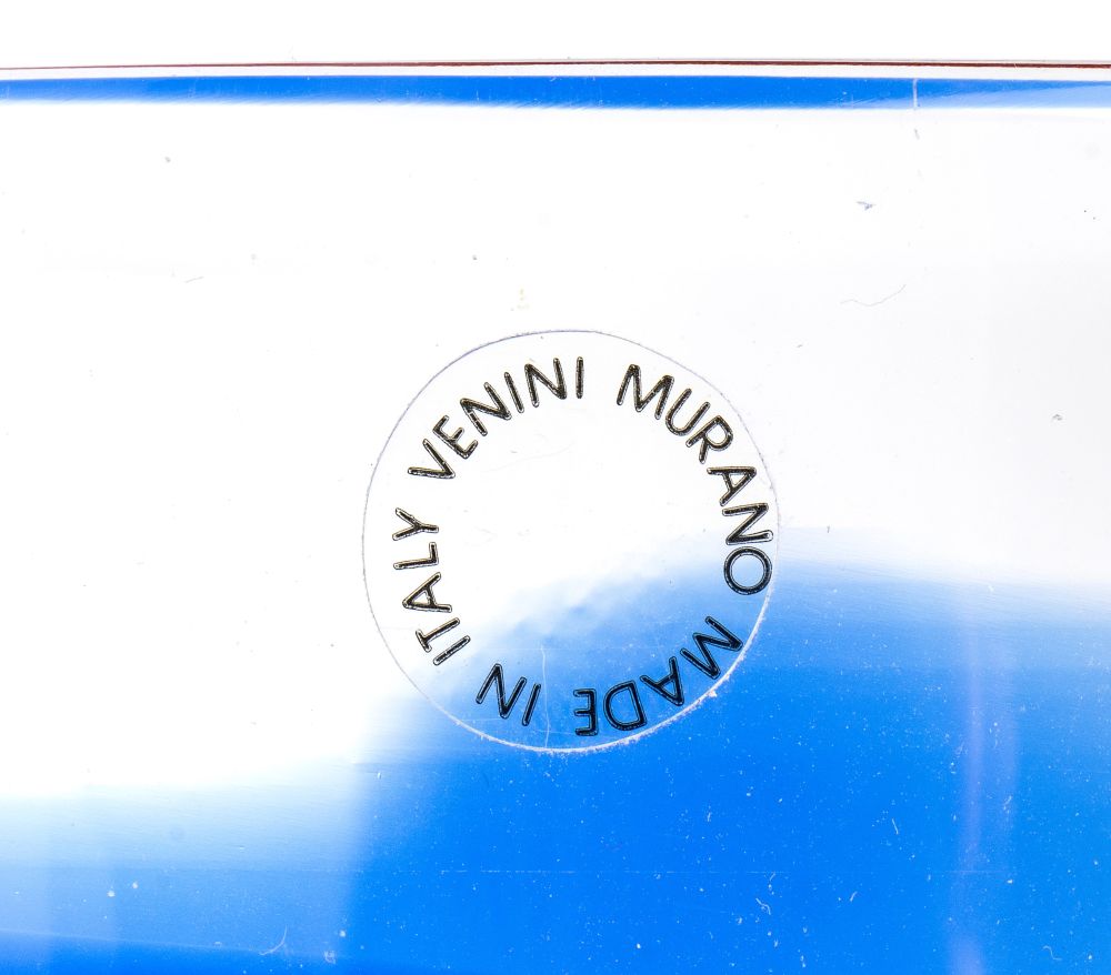 Sul vetro trasparente, prima della soffiatura, sono applicate delle fasce a forma di “anelli” in colore alternato di blu mare e rosso. In vibroincisione con iscrizione: Venini.