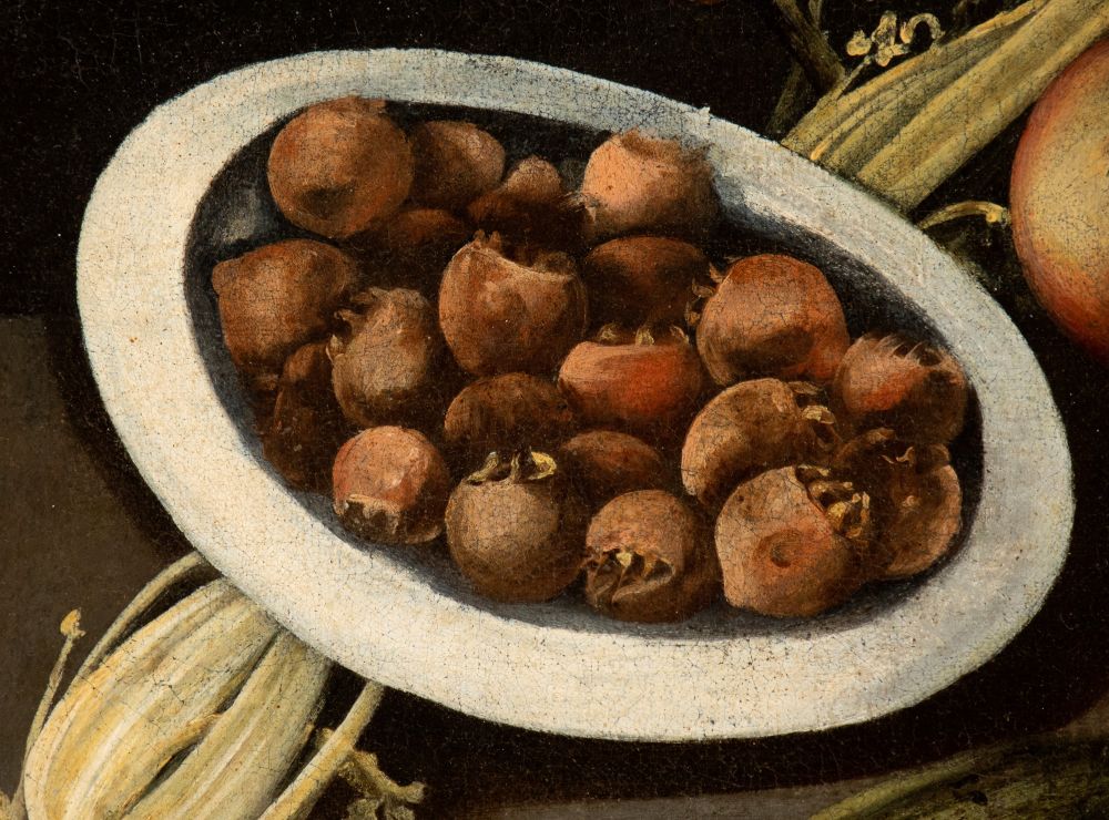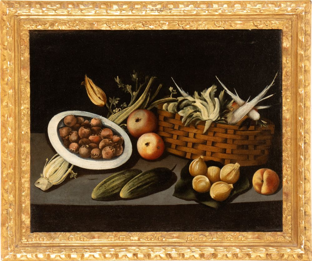 Natura morta con cesto di vimini, ortaggi e frutti