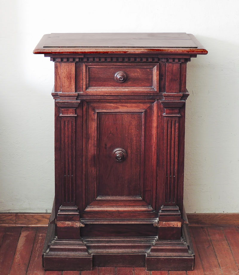 COPPIA DI COMODINI IN NOCE fine del XIX/inizio del XX secolo di gusto neorinascimentale, piano con sottostante cornice dentellata, un cassetto nella fascia ed uno sportello sottostante tra lesene scanalate, base a cornice h cm 90x63,5x41,5 A PAIR OF NEO RENAISSANCE WALNUT NIGHT TABLE, LATE 19TH/EARLY 20TH CENTURY