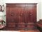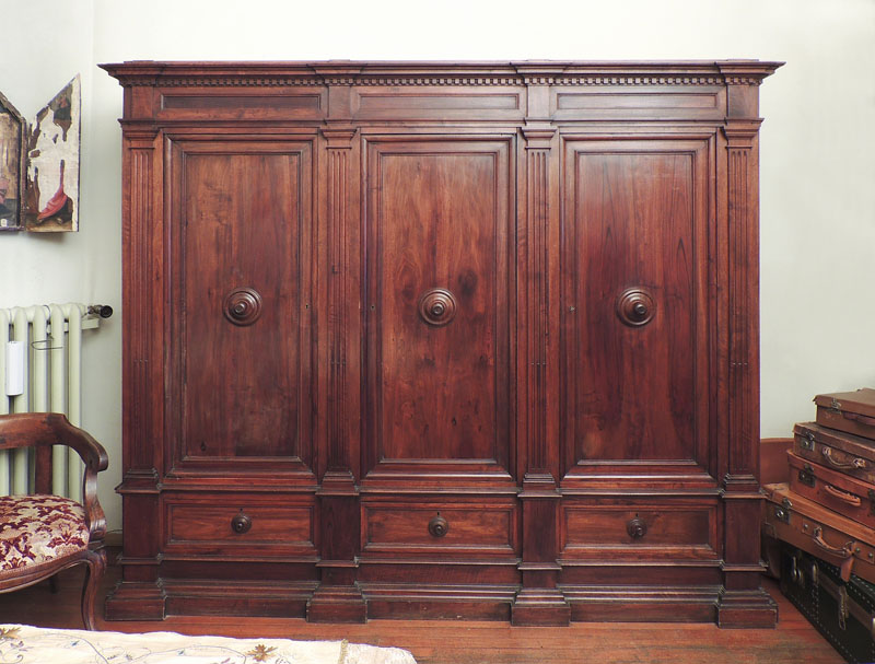ARMADIO IN NOCE fine del XIX/inizio del XX secolo di gusto neorinascimentale, cappello con fascia dentellata, fronte dritto a tre ante ripartite da lesene scanalate e tre mezzi cassetti sottostanti, al centro degli sportelli e dei cassetti rosoni con pomelli torniti, base a cornice h cm 227x266x65 A NEO RENAISSANCE WALNUT WARDROBE, LATE 19TH/EARLY 20TH CENTURY