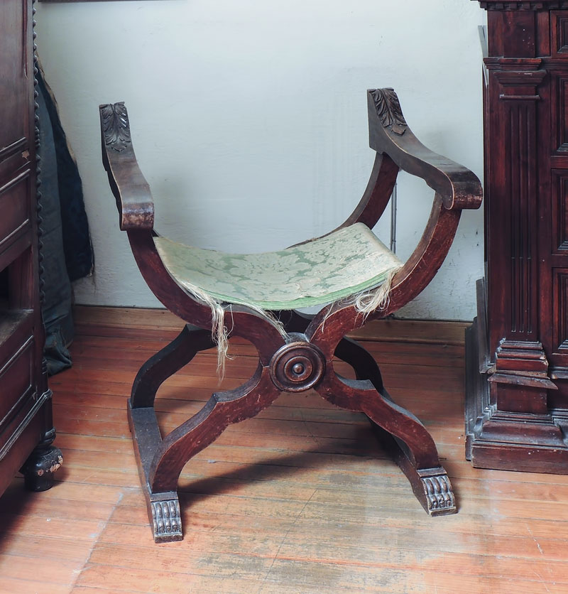COPPIA DI SEDIE SAVONAROLA IN NOCE fine del XIX secolo braccioli intagliati con foglie d'acanto, richiudibili, difetti e mancanze alla tappezzeria PAIR OF WALNUT "SAVONAROLA" ARMCHAIRS, LATE 19TH/ CENTURY
