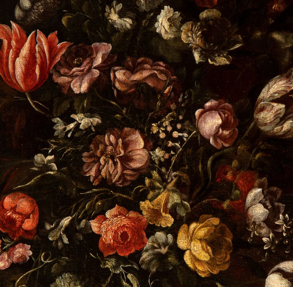 Coppia di grandi nature morte con bouquet di fiori in vasi di metallo istoriati
