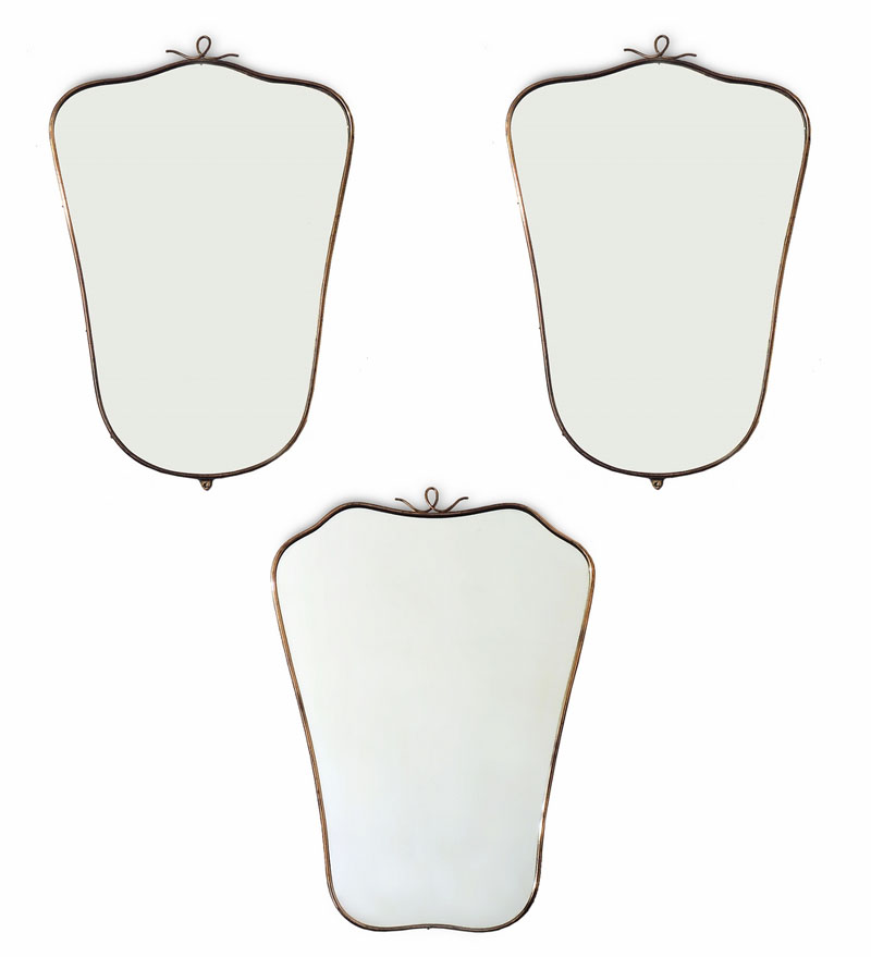 COPPIA DI SPECCHIERE IN METALLO DORATO Anni Sessanta di forma sagomata ed un'altra simile cm 63x46 (3) A PAIR OF GILDED METAL MIRRORS AND ONE SIMILAR