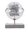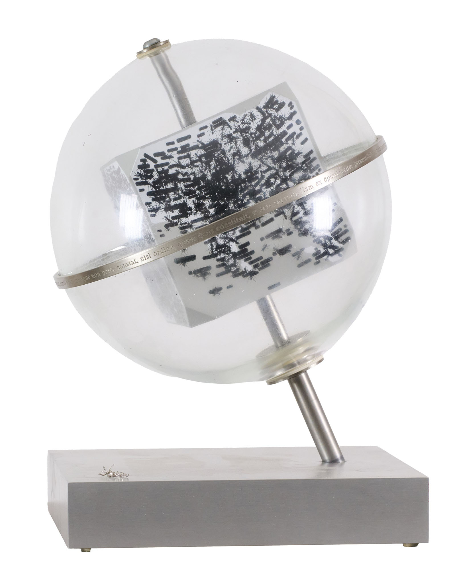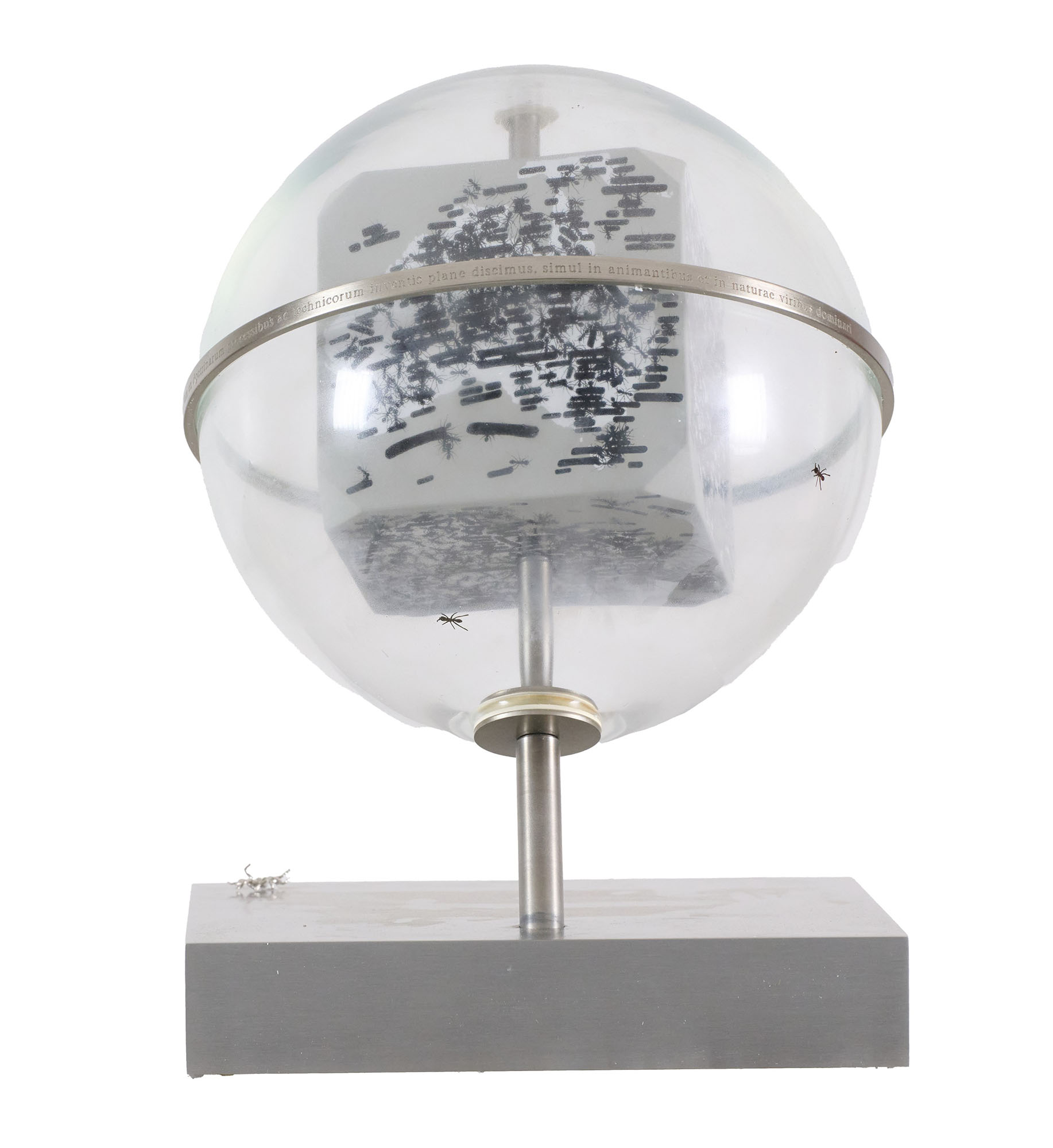 Cubo in legno serigrafato, globo in vetro di Murano soffiato e serigrafato, ferro e bronzo laminato in palladio Altezza cm. 35