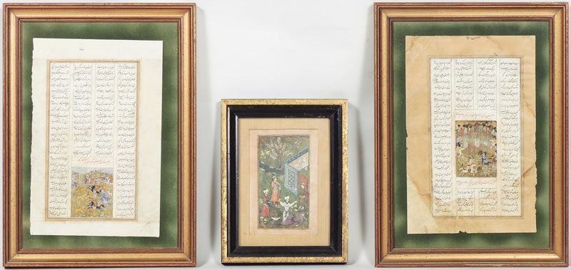 TRE MINIATURE Arte persiana del XVIII secolo Paesaggio con personaggi e Scene di Caccia, miniatura e due pagine miniate, in cornice difetti cm 28,5x18,8 circa, cm 16,5x7,5 (3) THREE OLD PERSIAN MINIATURES