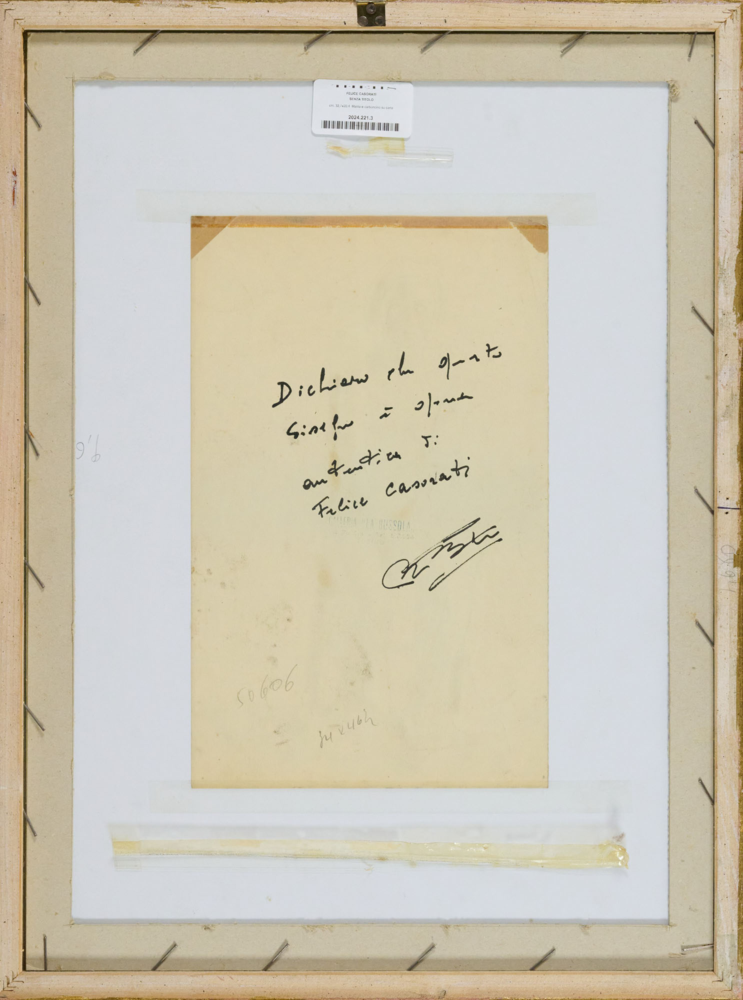 Sul verso: scritto di autenticità dell'Artista e timbro Galleria "La Bussola", Torino.