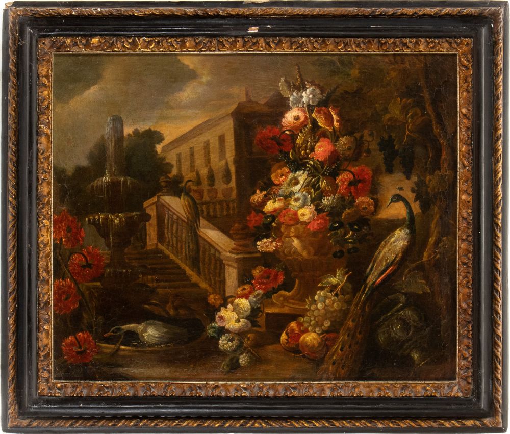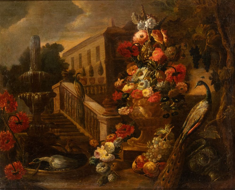 a) Vaso di fiori nel giardino di una villa con anatre e fontana; b) Vaso di fiori nel giardino di una villa con scalinata e pavoni. Coppia di dipinti
