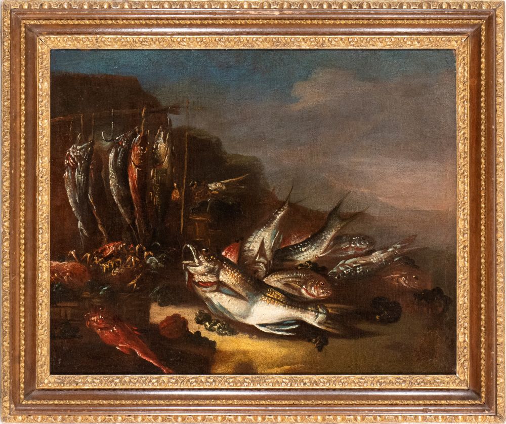 a) Natura morta con pesci e crostacei; b) Natura morta di pesci e conchiglie. Coppia di dipinti