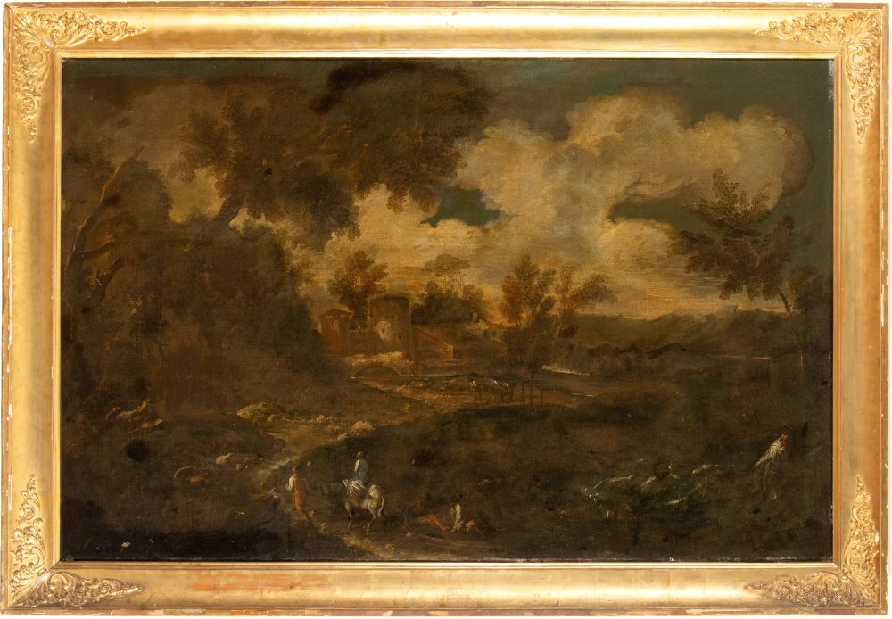 Paesaggio con corso d'acqua, ponte, monaco e viandanti
