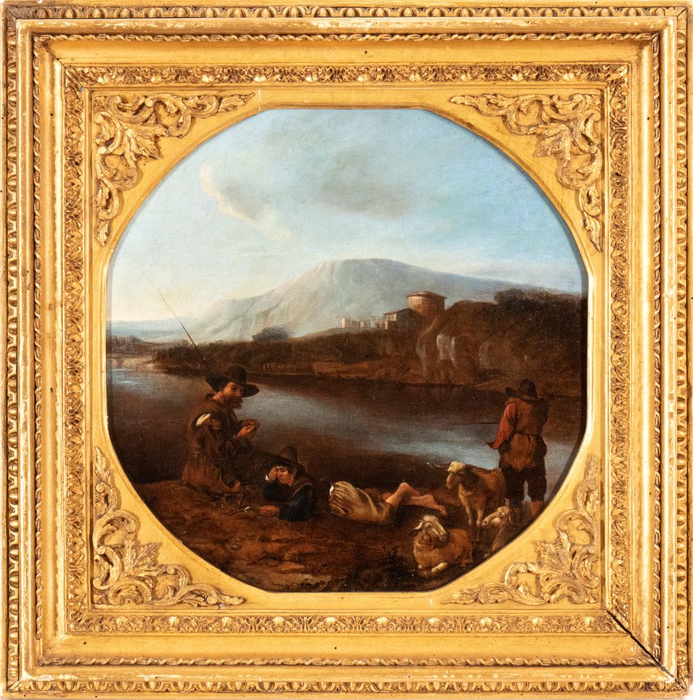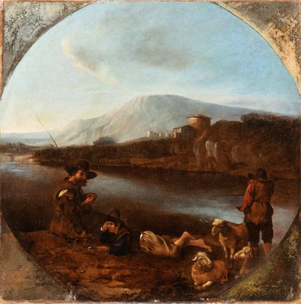 Bambocciante attivo a Roma, XVII secolo Pastori a riposo presso un corso...
