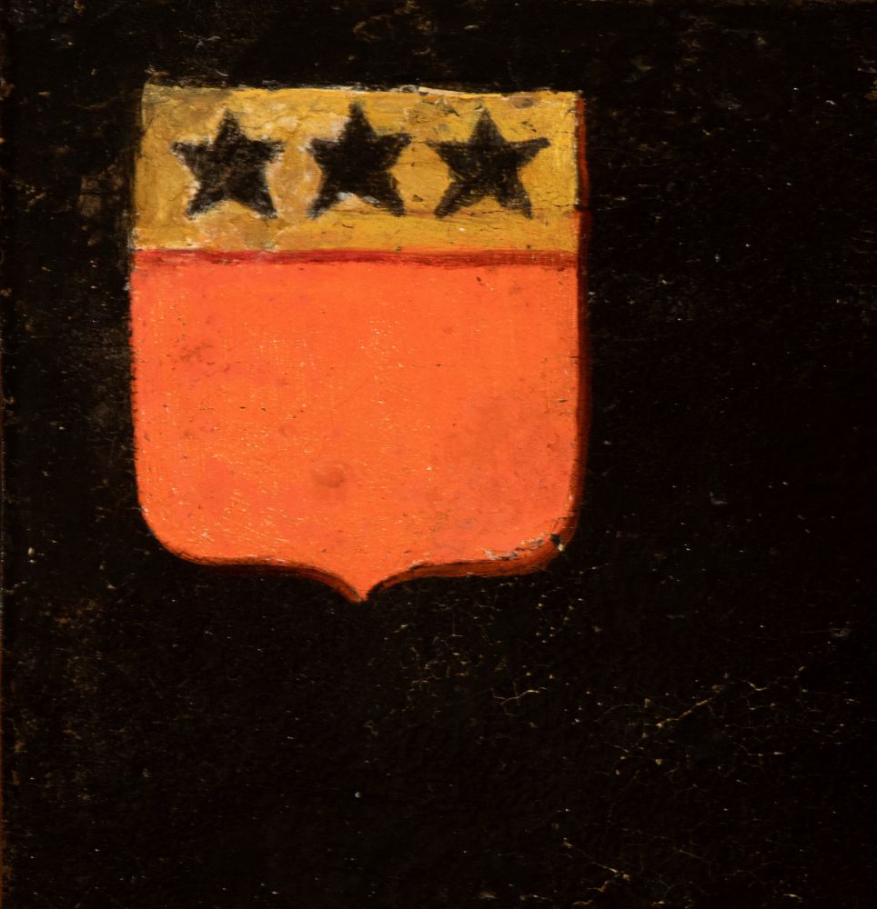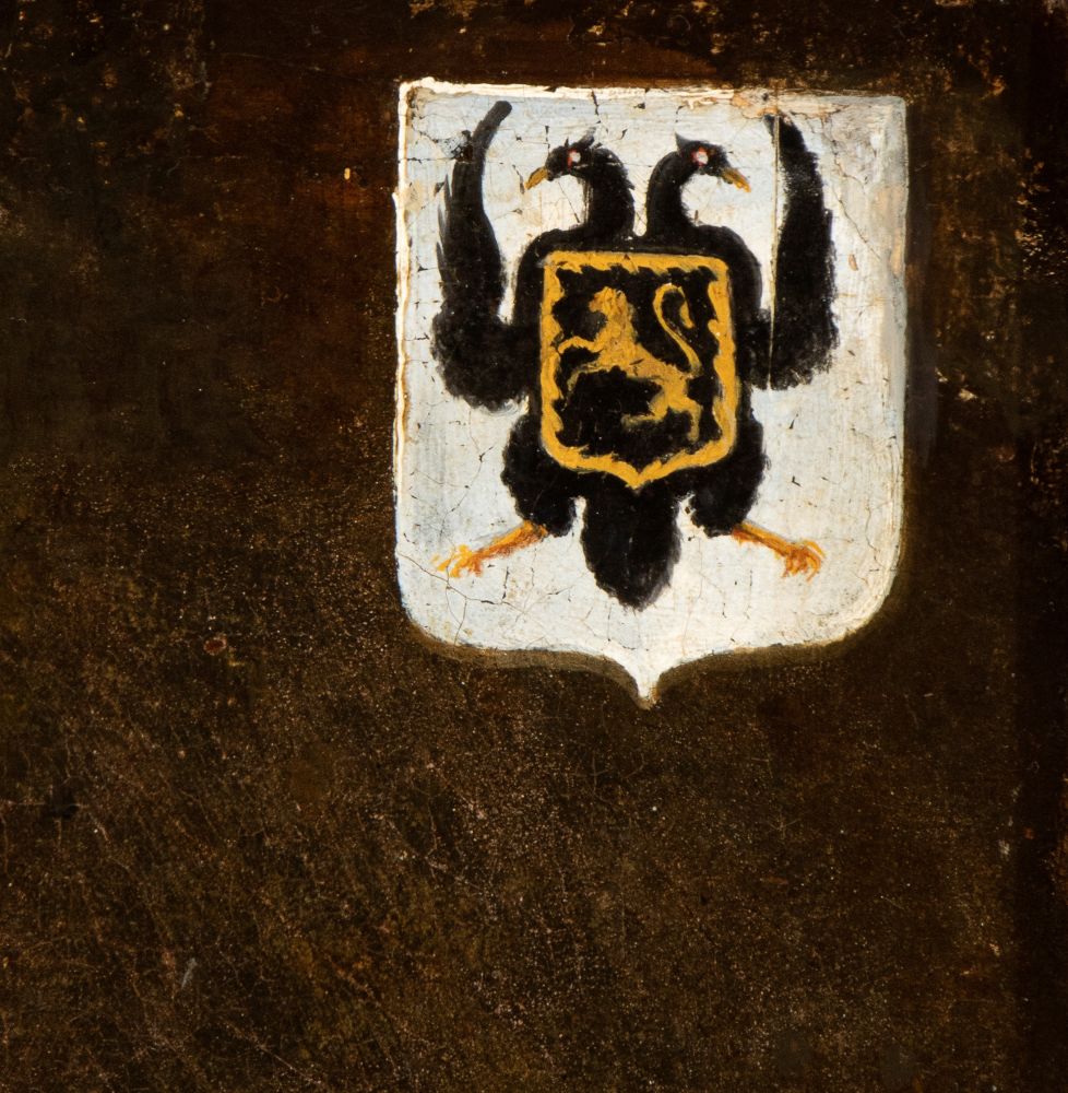 La coppia di dipinti recano agli angoli superiori gli stemmi gentilizi delle nobili famiglie di provenienza.