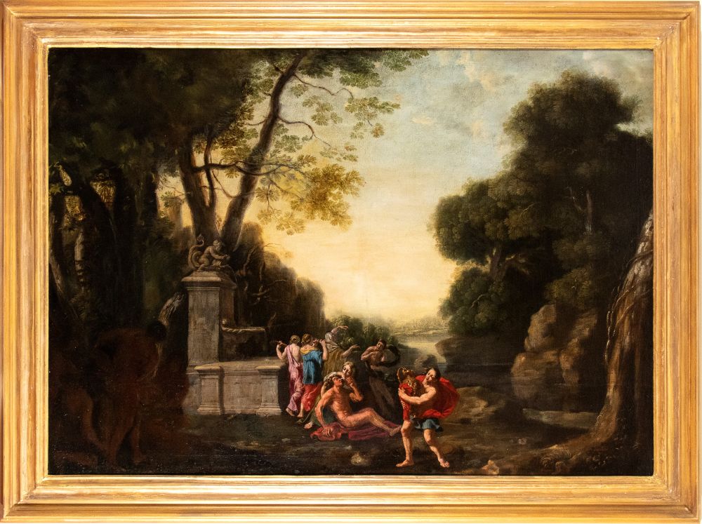 Paesaggio con fontana, corso d'acqua e scena di baccanale