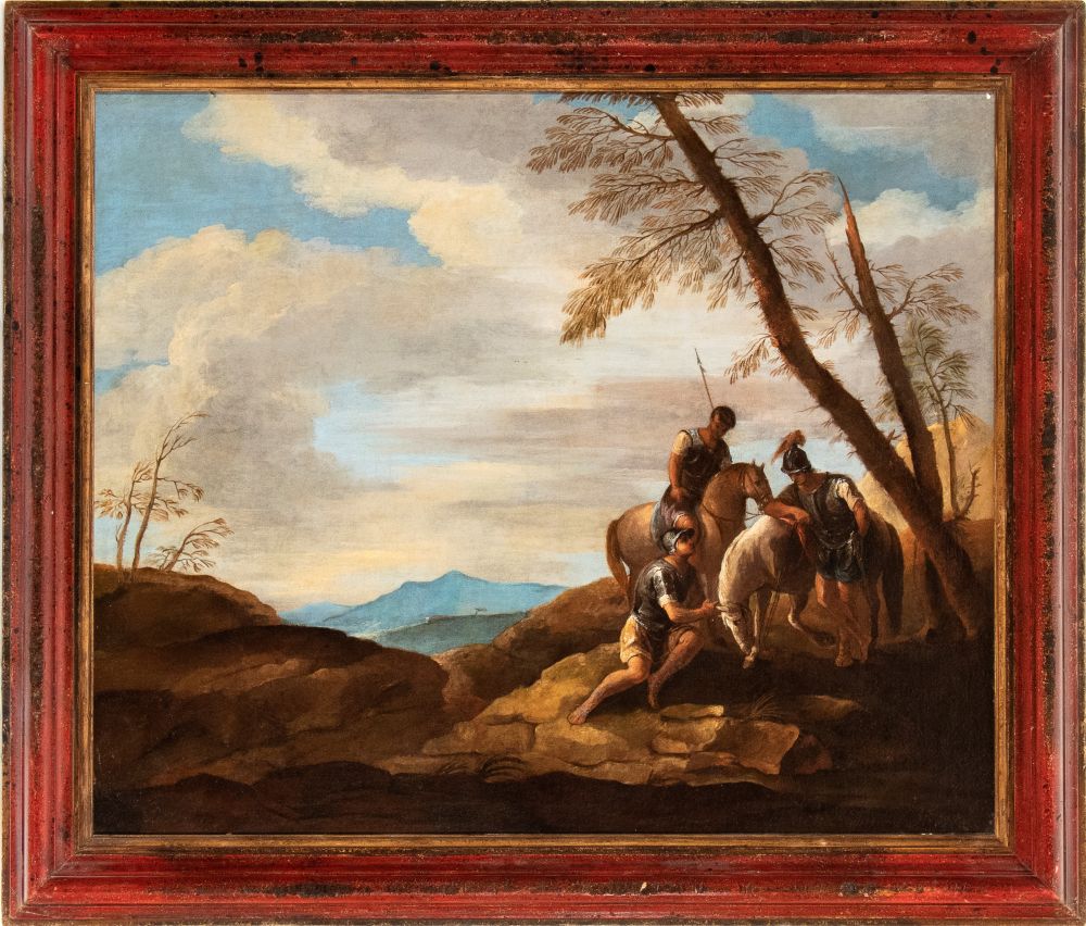 Salvator Rosa (seguace di) (Napoli, 1615 - 1673) Paesaggio con sosta di...