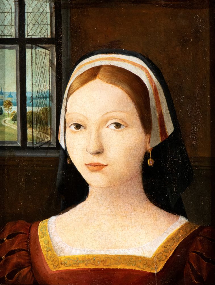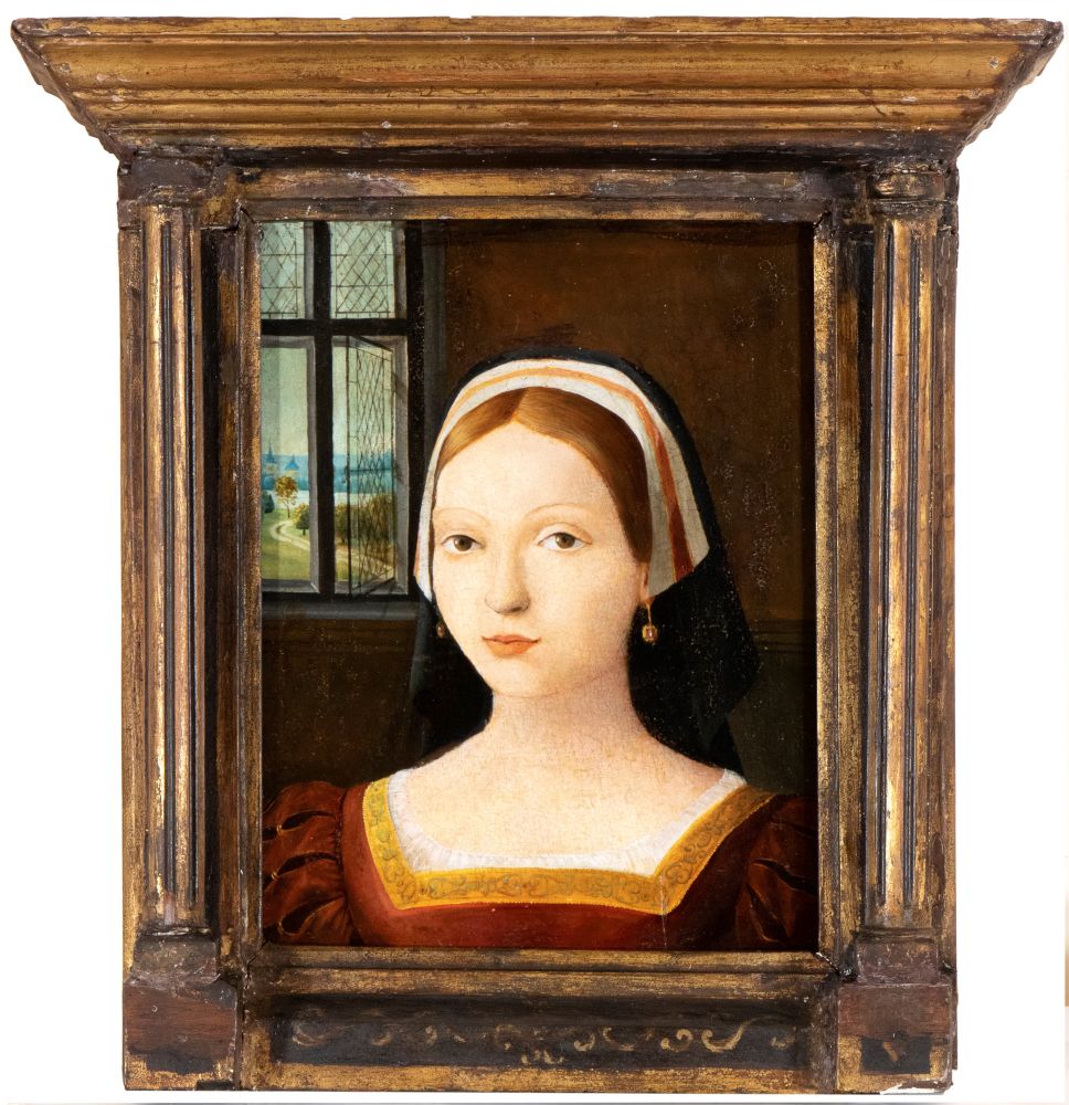 Artista fiammingo, XVI secolo Ritratto di dama con orecchini di rubino Olio...