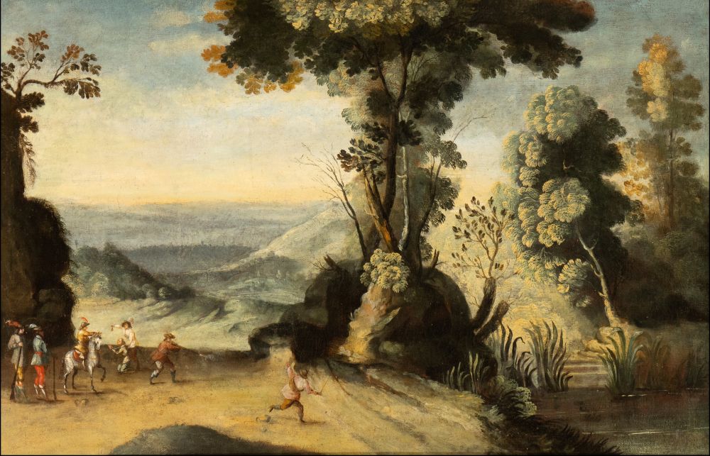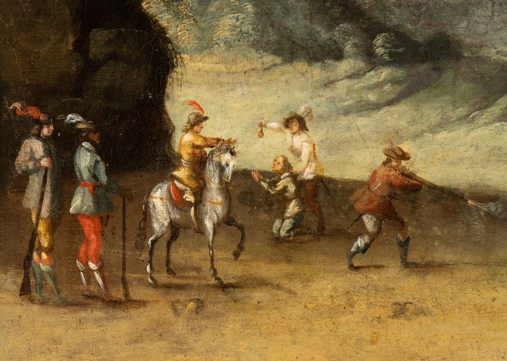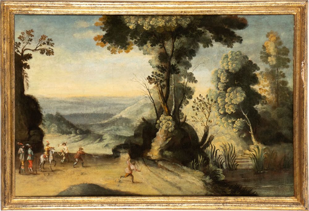 Artista fiammingo, XVIII secolo Paesaggio con agguato di briganti Olio su...