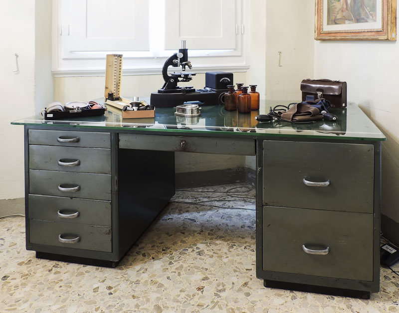 SCRIVANIA A BANCO IN METALLO VERDE ANNI CINQUANTA un mezzo cassetto centrale...