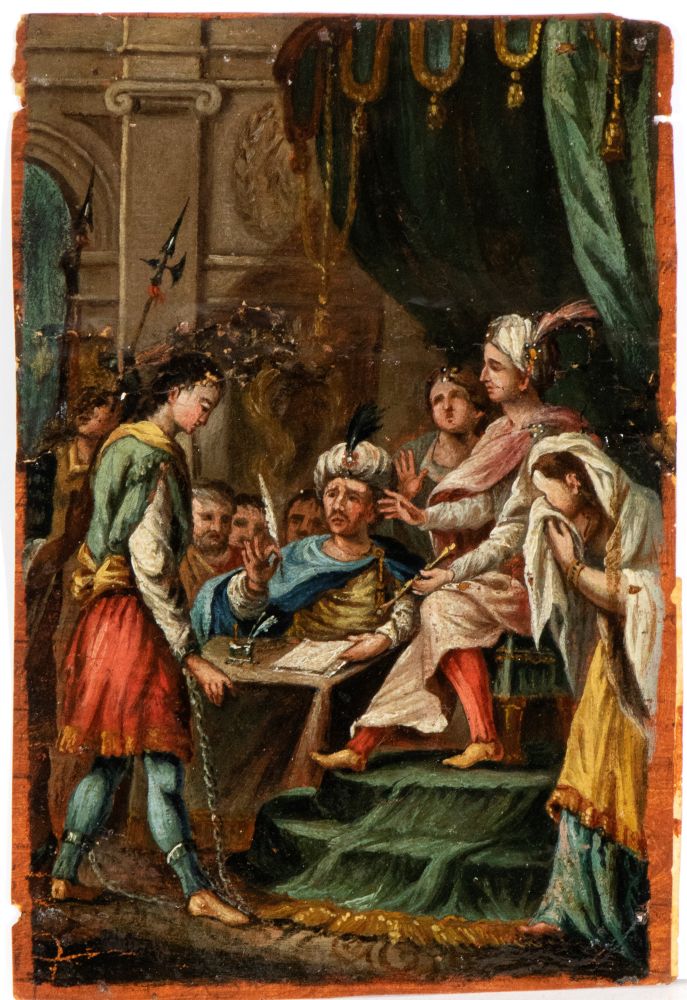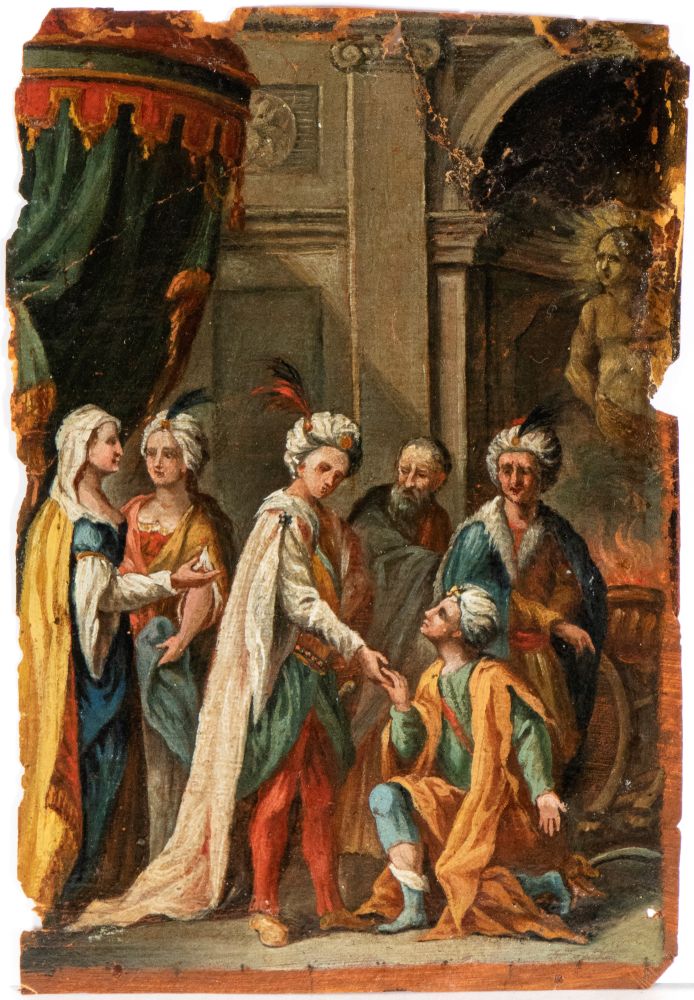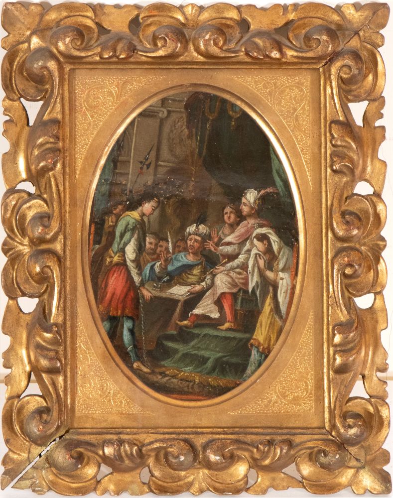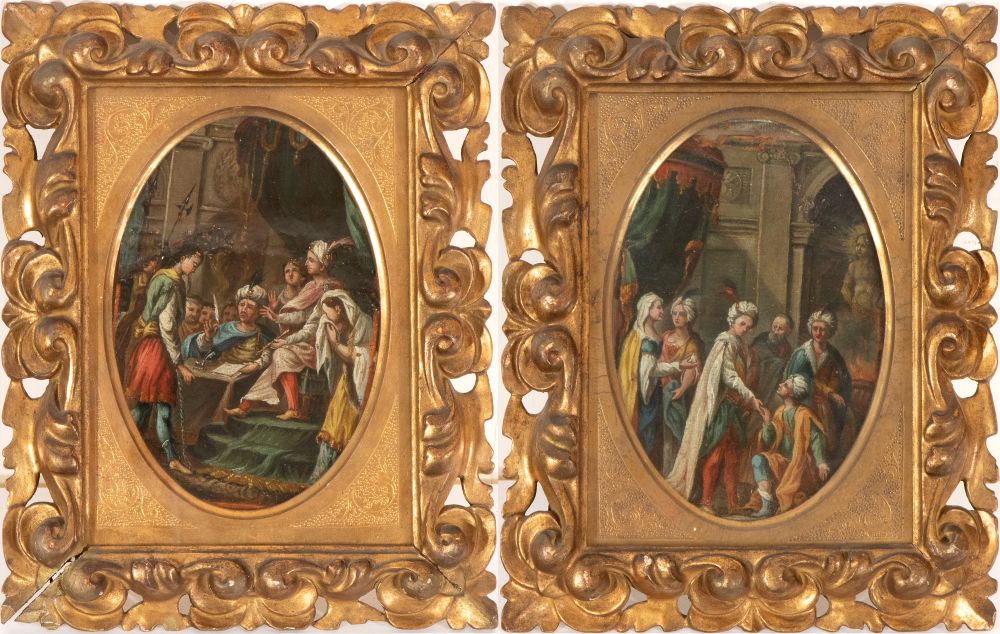a) Scena di giudizio con prigioniero; b) Scena di ringraziamento con genuflessione. Coppia di dipinti