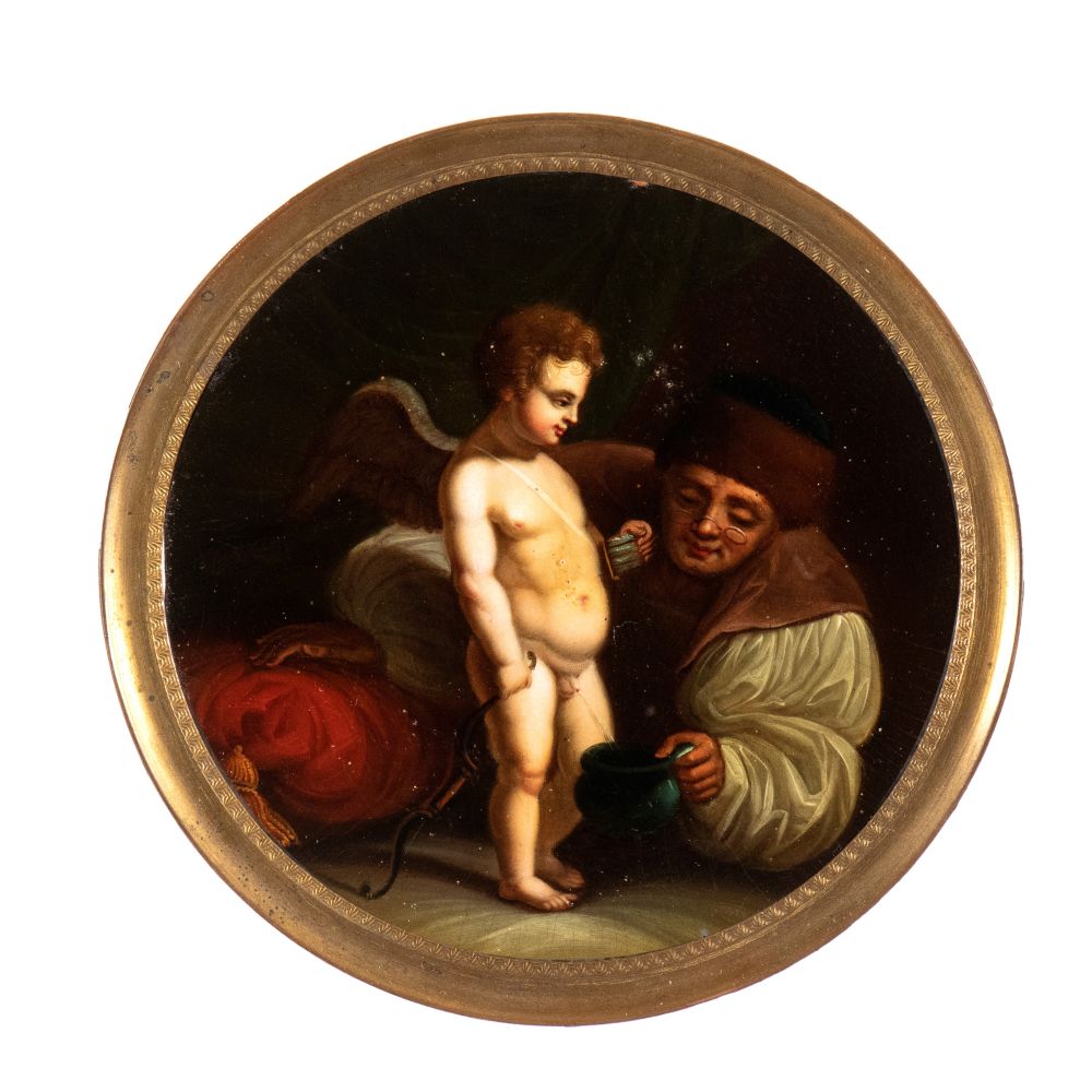 Artista fiammingo, XVIII-XIX secolo Amorino che minge Olio su tavoletta Ø cm....