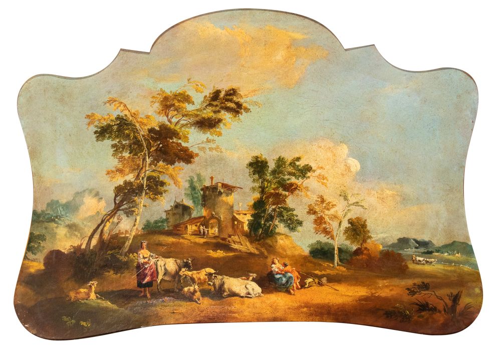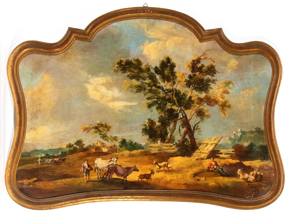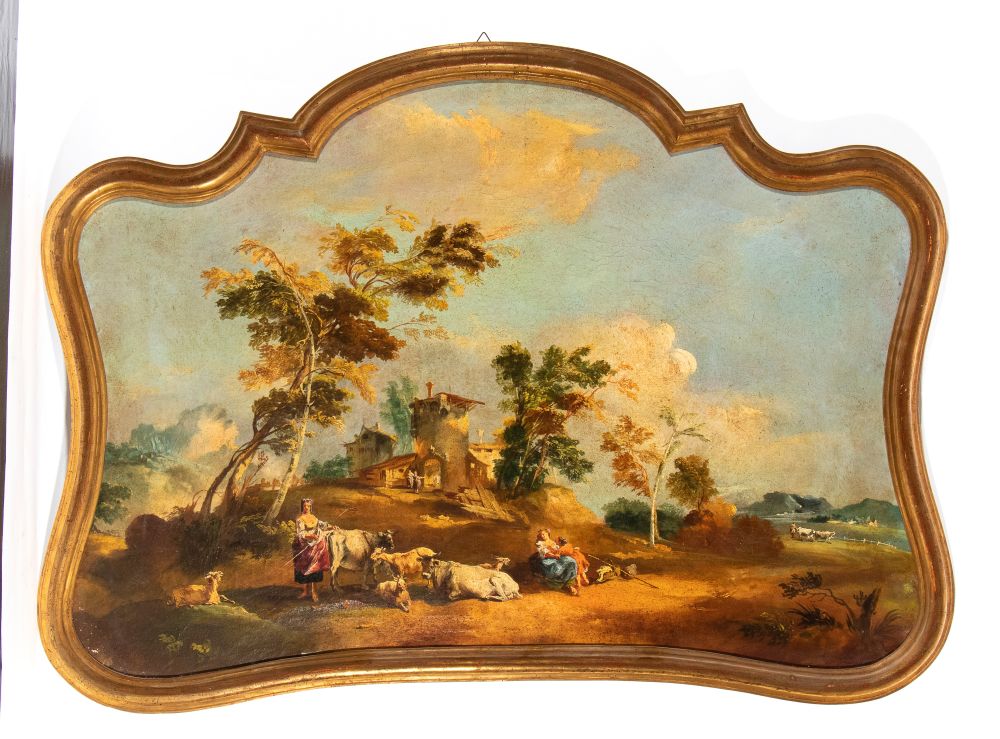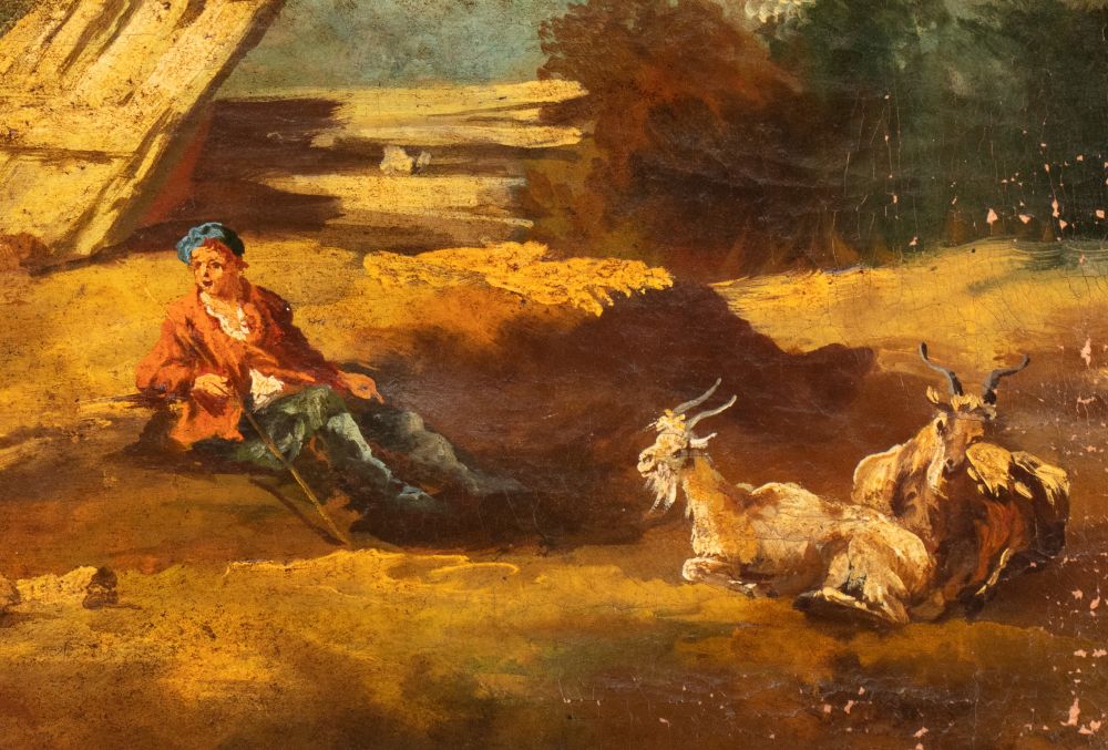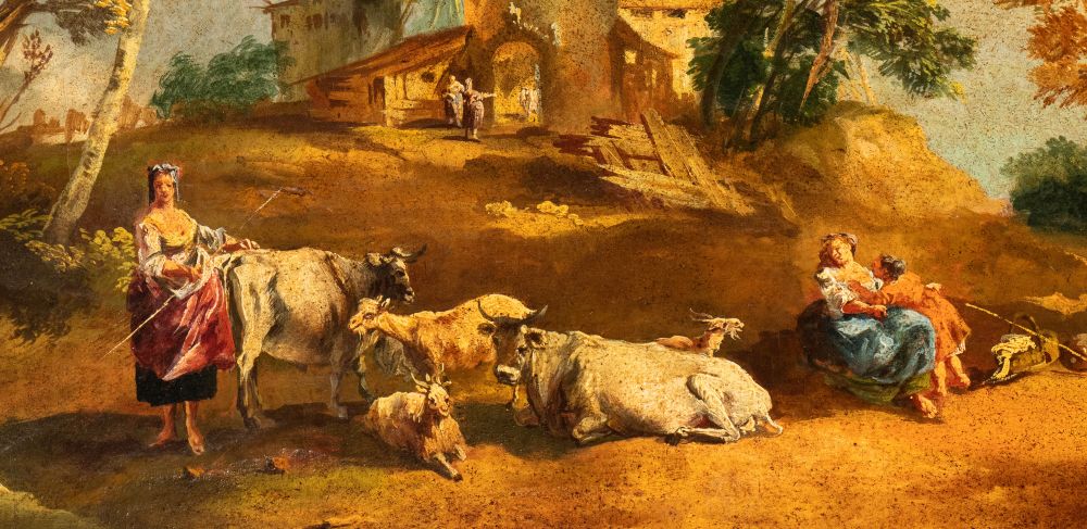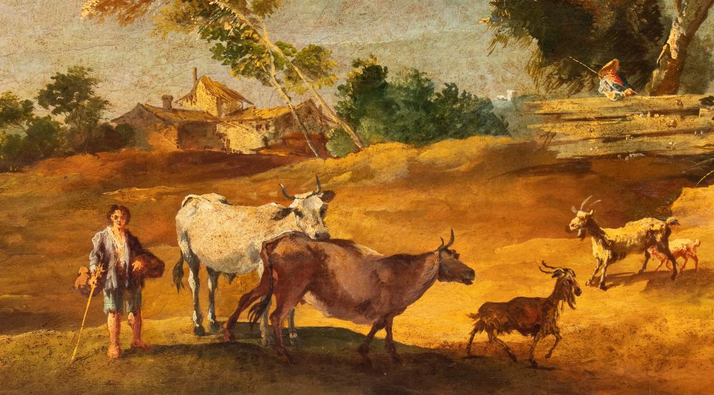 a) Paesaggio con pastori e armenti; b) Paesaggio con pastorelle, greggi e caseggiato. Coppia di dipinti
