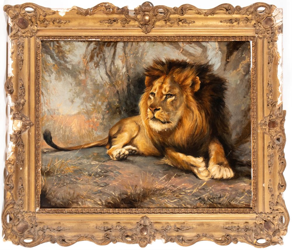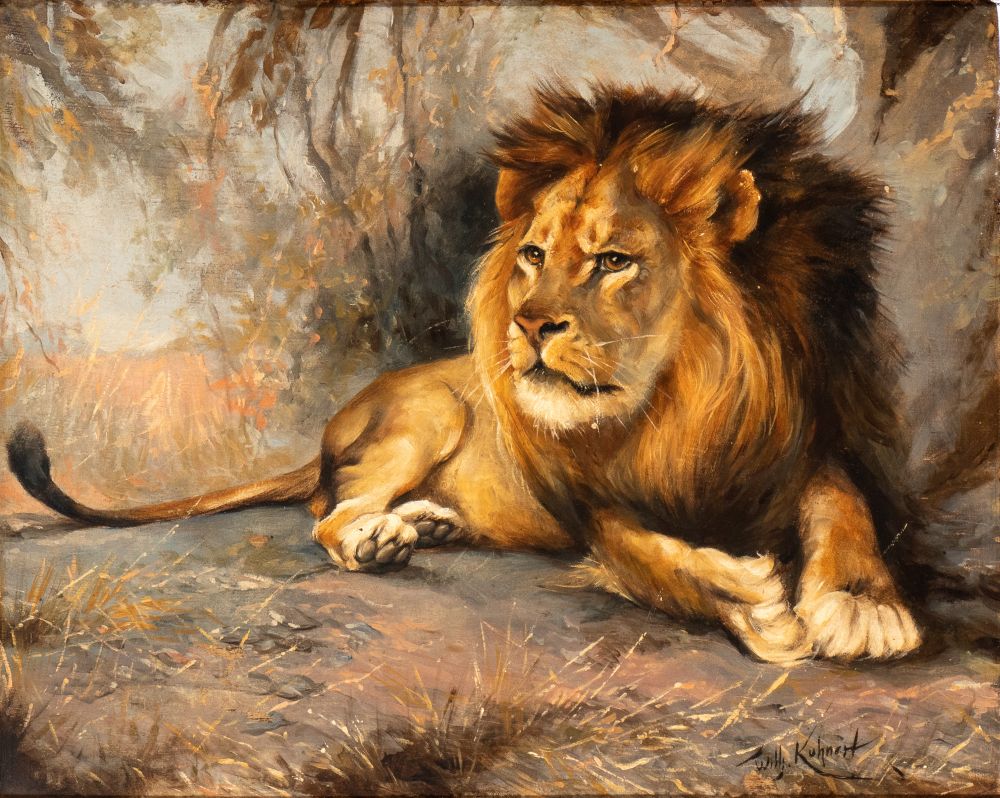 Wilhelm Kuhnert (attribuito a) (Opole, 1865 - Flims, 1926) Leone a riposo Olio su tavola cm....