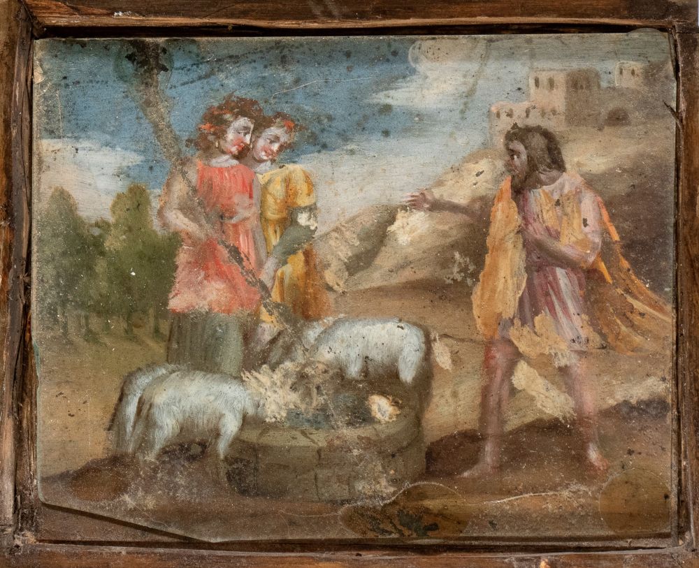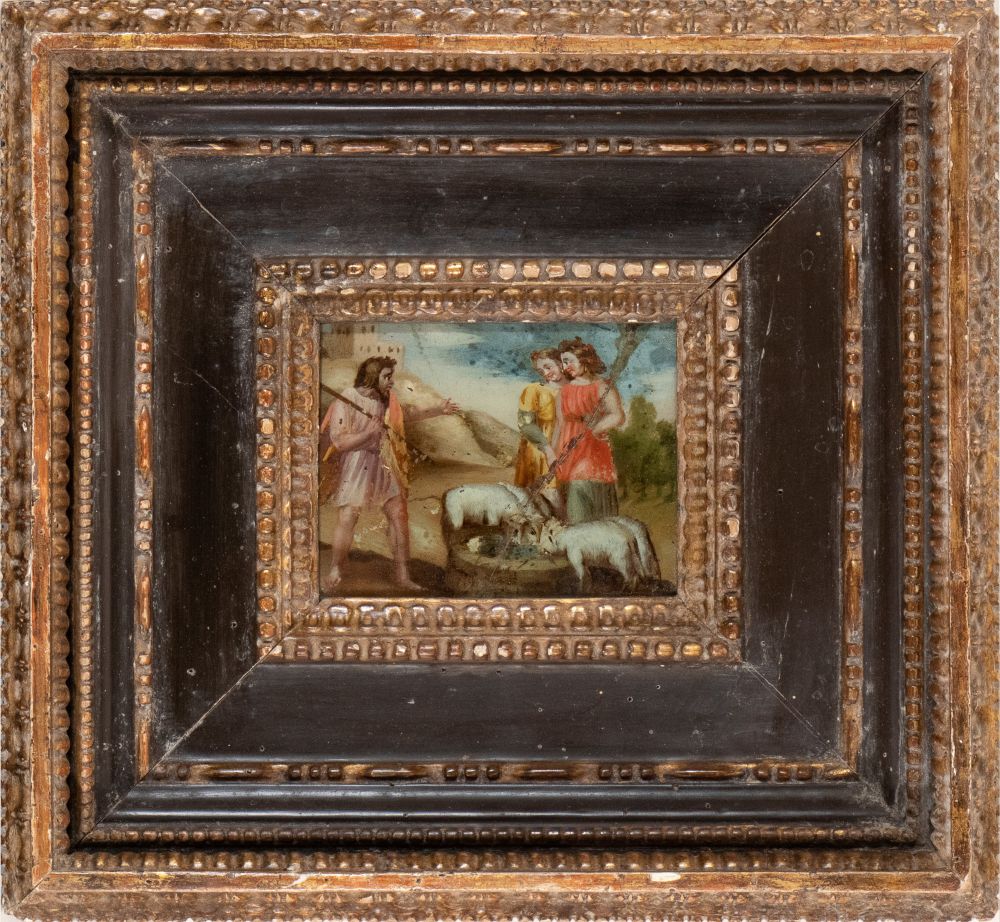 Artista meridionale, XVIII secolo Mosè al pozzo Olio su vetro cm. 14x17,5....