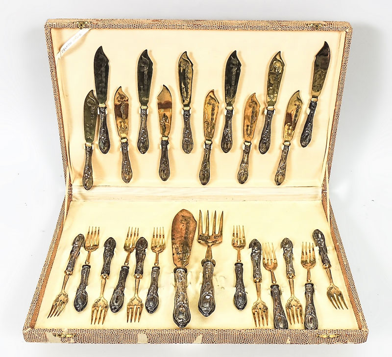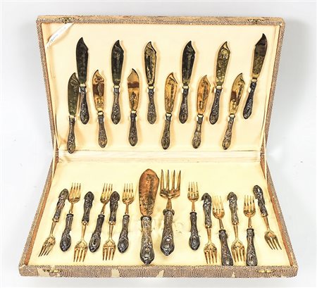 SERVITO DI POSATE DA PESCE manici rivestiti in argento, lame dorate, decorato...