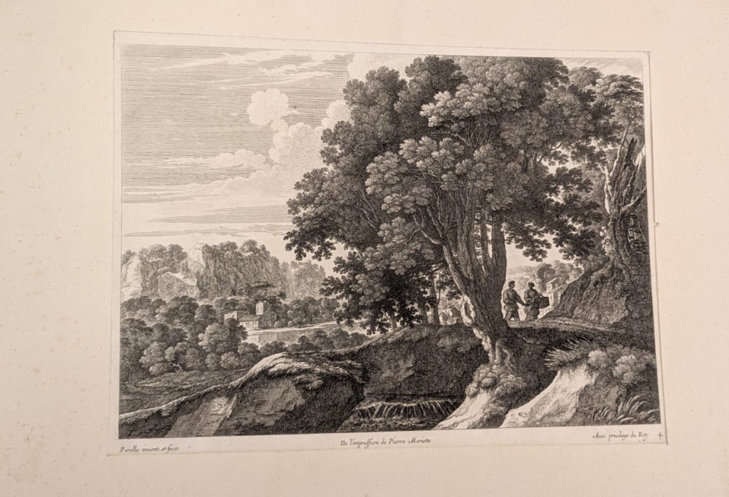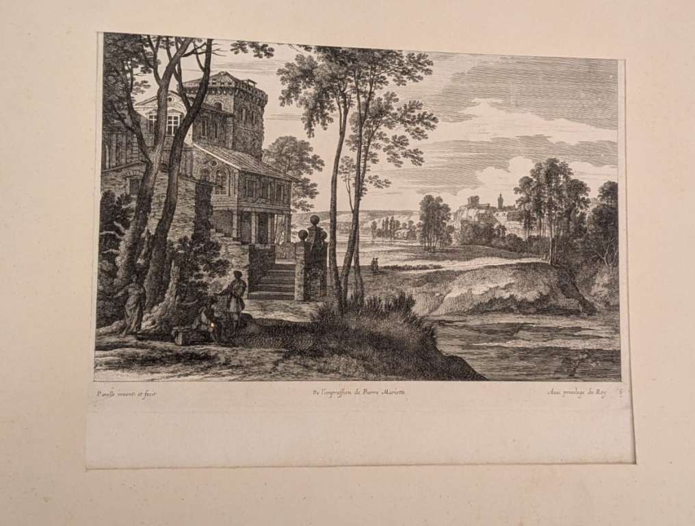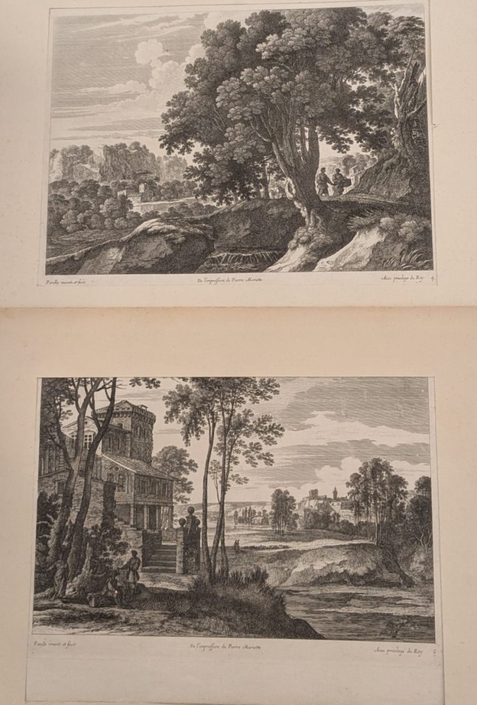 Gabriel Perelle (Vernon, 1604 - Parigi, 1677) Lotto di 2 incisioni tratte da De L'impression de Pierre Mariette avec Privilege du Roy cm 29,5x42