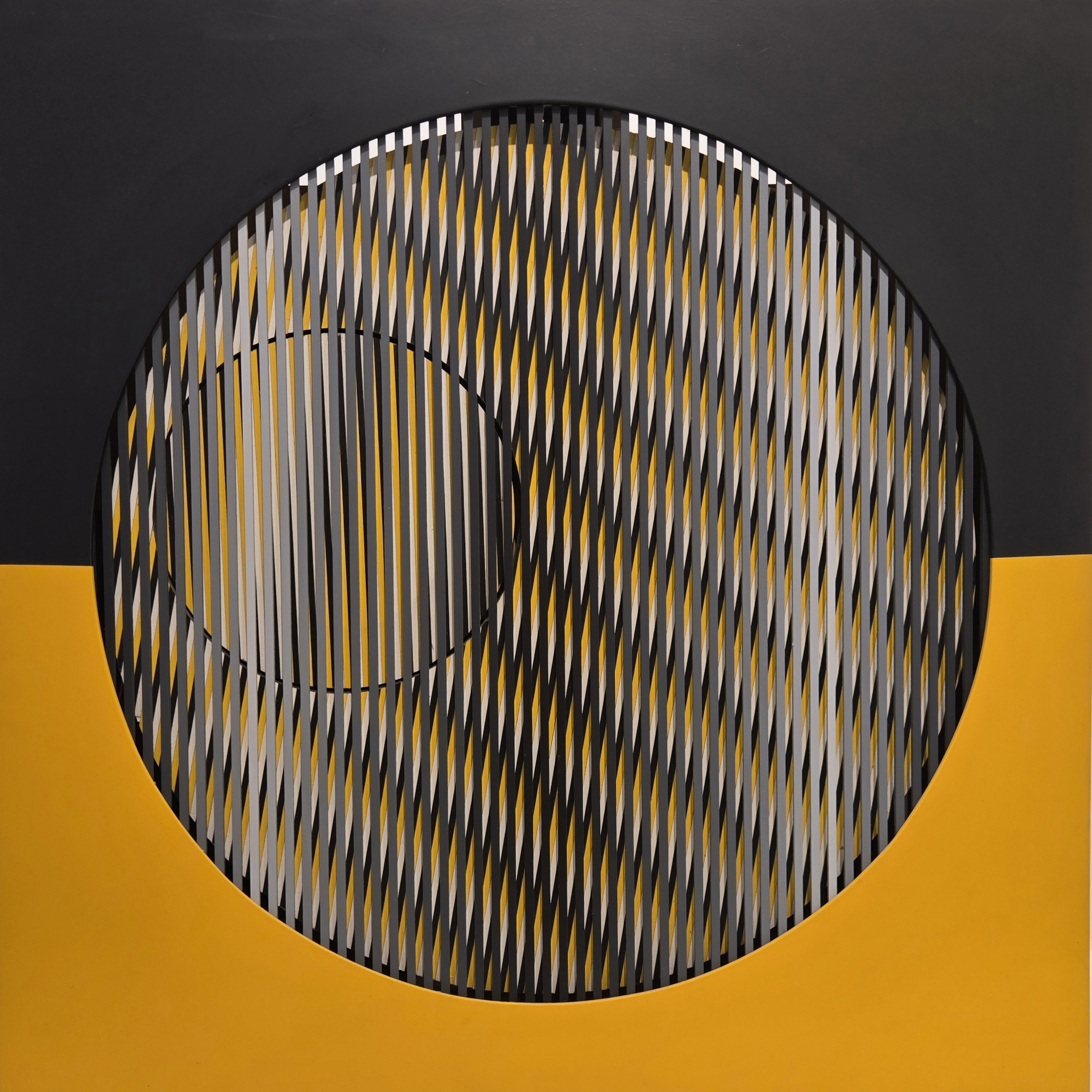Angelo Brescianini, 1948-2016, scultura in legno pitturata motorizzata con motore perfettamente funzionante, cm 80 x 80 x 11: firma data e titolo a retro “ sinfonia con solista 2006 “