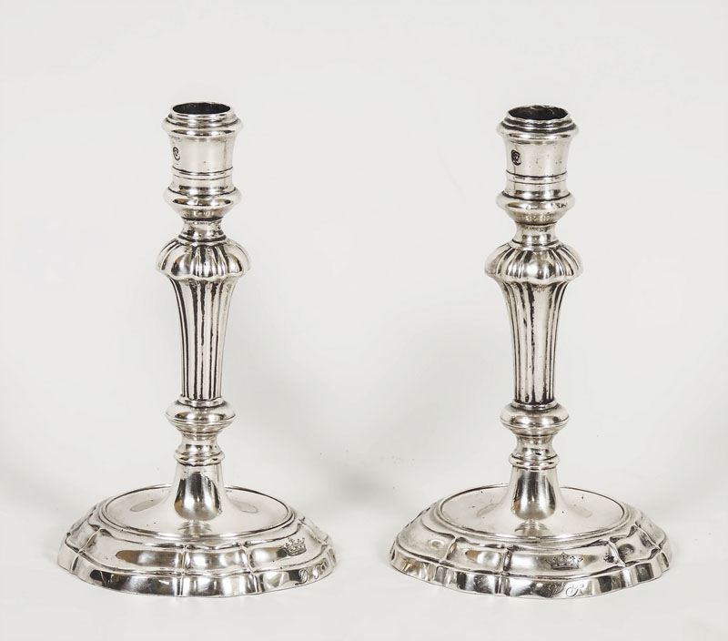COPPIA DI CANDELIERI IN ARGENTO Roma, XVIII secolo gr 525, h cm 16,5 PAIR OF SILVER CANDLESTICKS, ROME, 18TH CENTURY