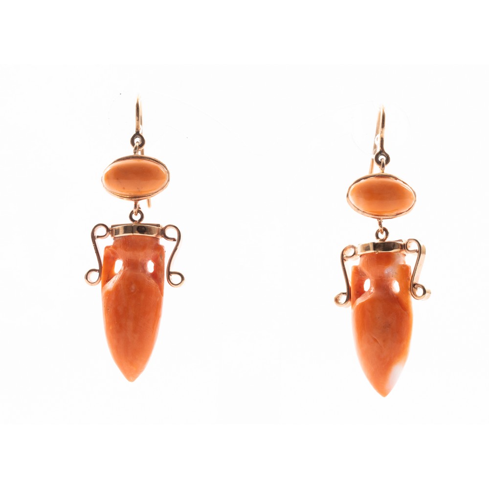ORECCHINI di gusto neoclassico in oro giallo 9 KT con anfore e cabochon in corallo (g. 15,50).