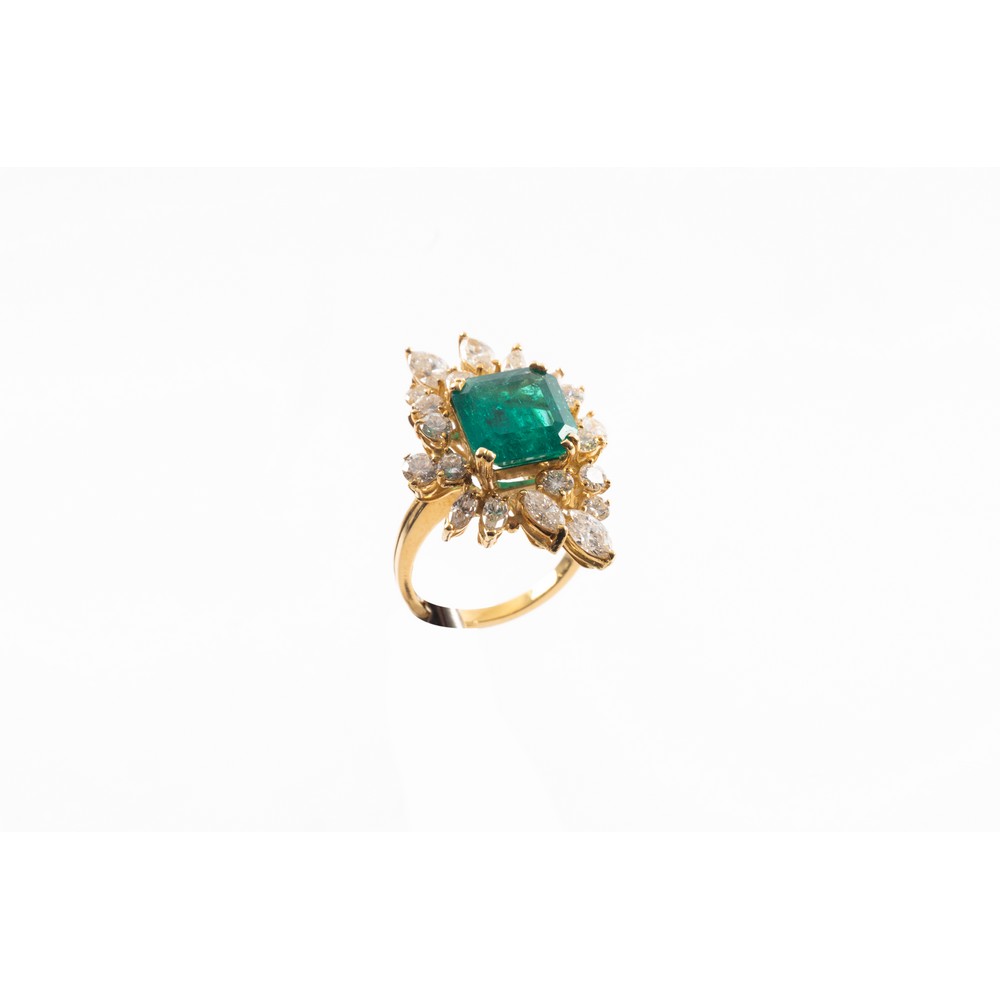 ANELLO in oro giallo 18 KT con diamanti taglio brillante ct. 1,14 H COLOR VS1, diamanti taglio marquise ct. 1,26 J COLOR VS2 e smeraldo colombiano taglio quadrato a gradini ct. 3,95 (g. 11,10) (presenta certificato gemmologico).