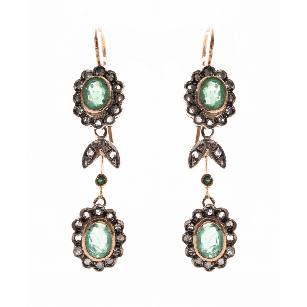 ORECCHINI in oro giallo 9 KT e argento con diamanti ct. 0,37 peso di stima e smeraldi ct. 3,78 peso di stima (g. 7,20).