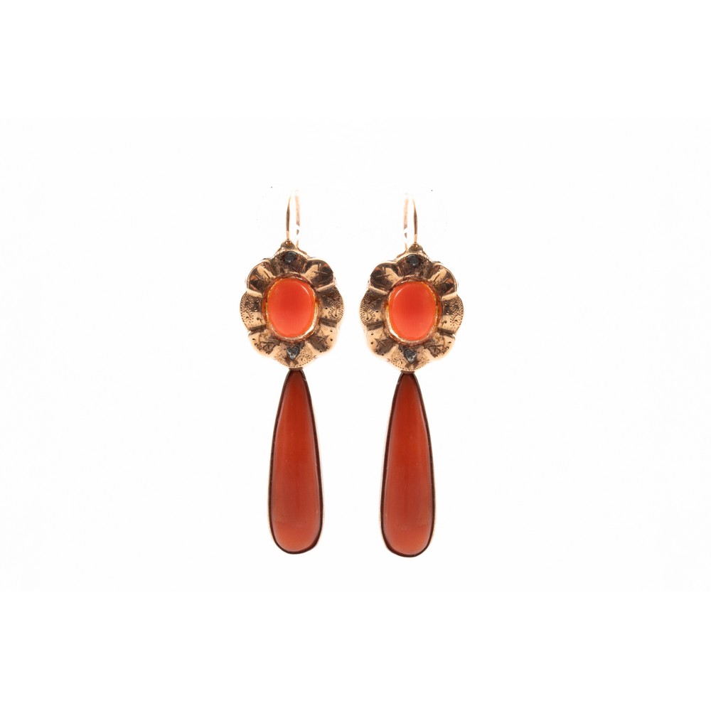 ORECCHINI in oro giallo 9 KT inciso e corallo rosso (g. 7,20).