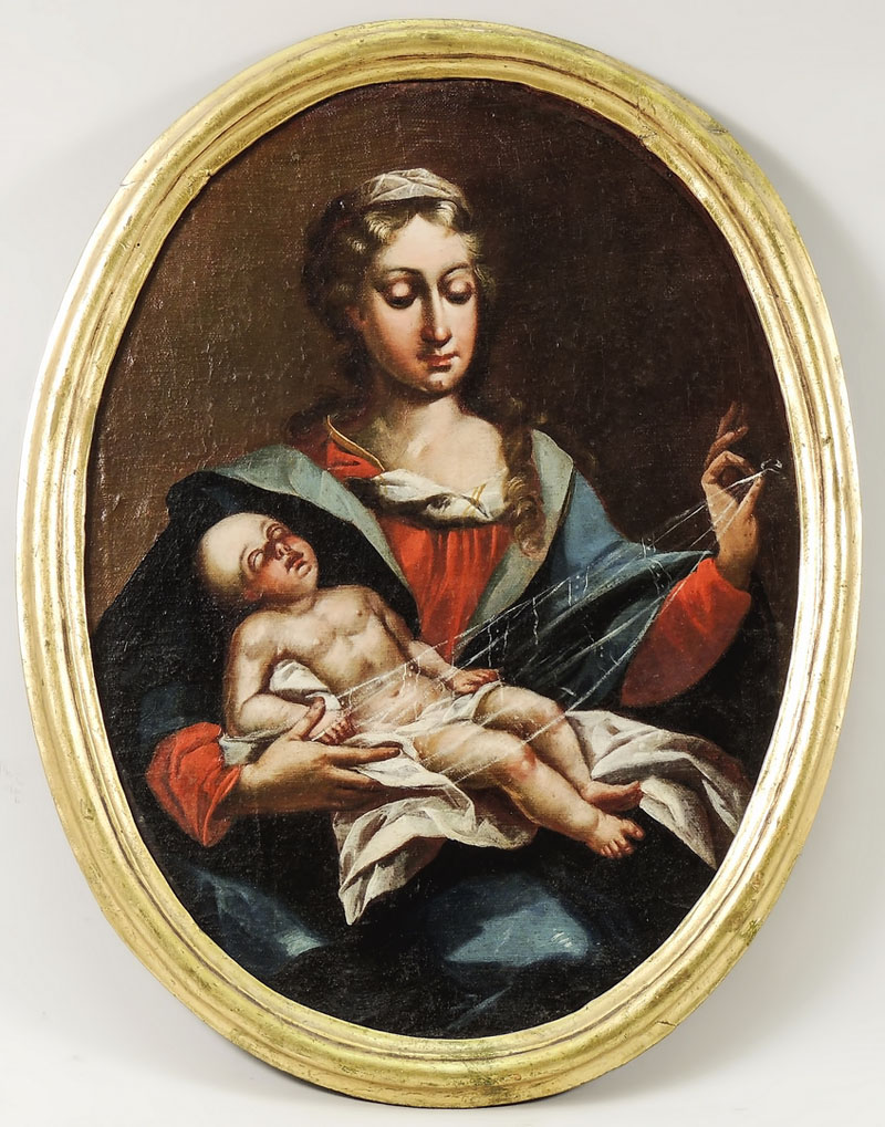 SCUOLA TOSCANA DELLA FINE DEL XVIII SECOLO Madonna con Bambino olio su tela in ovale applicata a tavoletta, in cornice dorata cm 56x42 TUSCAN SCHOOL OF 18TH CENTURY, THE MADONNA WITH CHILD, OIL ON OVAL CANVAS LAID ON PANEL