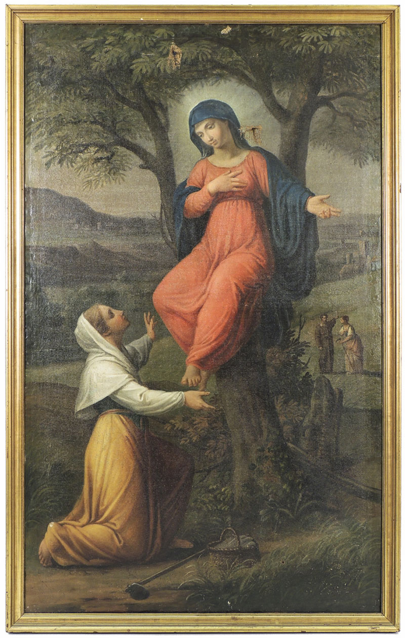 SCUOLA DELL'ITALIA CENTRALE DELL'INIZIO DEL XIX SECOLO Apparizione della Madonna della Noce olio su tela, in cornice, difetti cm 148x88 THE APPARITION OF MADONNA, OIL ON CANVAS